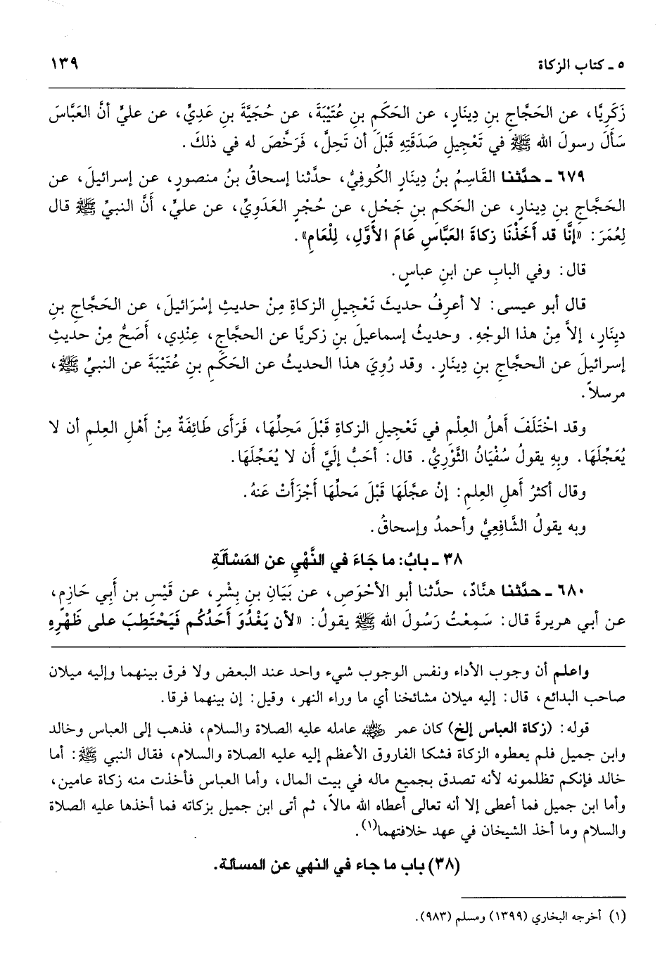 قوله: (زكاة العباس إلخ) كان عمر عامله عليه الصلاة والسلام، فذهب إلى العباس وخالد وابن جميل فلم يعطوه الزكاة فشكا الفاروق الأعظم إليه عليه الصلاة والسلام، فقال النبي - صَلَّى اللهُ عَلَيْهِ وَسَلَّمَ -: أما خالد فإنكم تظلمونه لأنه تصدق بجميع ماله في بيت المال، وأما العباس فأخذت منه زكاة عامين، وأما ابن جميل فما أعطى إلا أنه تعالى أعطاه الله مالاً، ثم أتى ابن جميل بزكاته فما أخذها عليه الصلاة والسلام وما أخذ الشيخان في عهد خلافتهما.