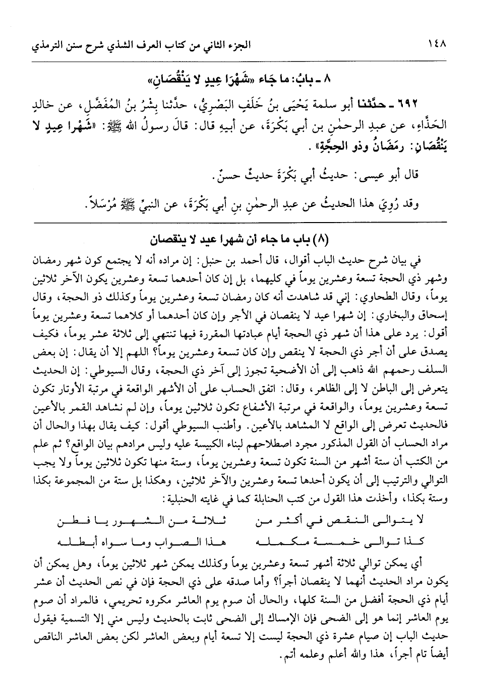 [692] في بيان شرح حديث الباب أقوال، قال أحمد بن حنبل: إن مراده أنه لا يجتمع كون شهر رمضان وشهر ذي الحجة تسعة وعشرين يوماً في كليهما، بل إن كان أحدهما تسعة وعشرين يكون الآخر ثلاثين يوماً، وقال الطحاوي: إني قد شاهدت أنه كان رمضان تسعة وعشرين يوماً وكذلك ذو الحجة، وقال إسحاق والبخاري: إن شهرا عيد لا ينقصان في الأجر وإن كان أحدهما أو كلاهما تسعة وعشرين يوماً أقول: يرد على هذا أن شهر ذي الحجة أيام عبادتها المقررة فيها تنتهي إلى ثلاثة عشر يوماً، فكيف يصدق على أن أجر ذي الحجة لا ينقص وإن كان تسعة وعشرين يوماً؟ اللهم إلا أن يقال: إن بعض السلف رحمهم الله ذاهب إلى أن الأضحية تجوز إلى آخر ذي الحجة، وقال السيوطي: إن الحديث يتعرض إلى الباطن لا إلى الظاهر، وقال: اتفق الحساب على أن الأشهر الواقعة في مرتبة الأوتار تكون تسعة وعشرين يوماً، والواقعة في مرتبة الأشفاع تكون ثلاثين يوماً، وإن لم نشاهد القمر بالأعين فالحديث تعرض إلى الواقع لا المشاهد بالأعين. وأطنب السيوطي أقول: كيف يقال بهذا والحال أن مراد الحساب أن القول المذكور مجرد اصطلاحهم لبناء الكبيسة عليه وليس مرادهم بيان الواقع؟ ثم علم من الكتب أن ستة أشهر من السنة تكون تسعة وعشرين يوماً، وستة منها تكون ثلاثين يوماً ولا يجب التوالي والترتيب إلى أن يكون أحدها تسعة وعشرين والآخر ثلاثين، وهكذا بل ستة من المجموعة بكذا وستة بكذا، وأخذت هذا القول من كتب الحنابلة كما في غايته الحنبلية: