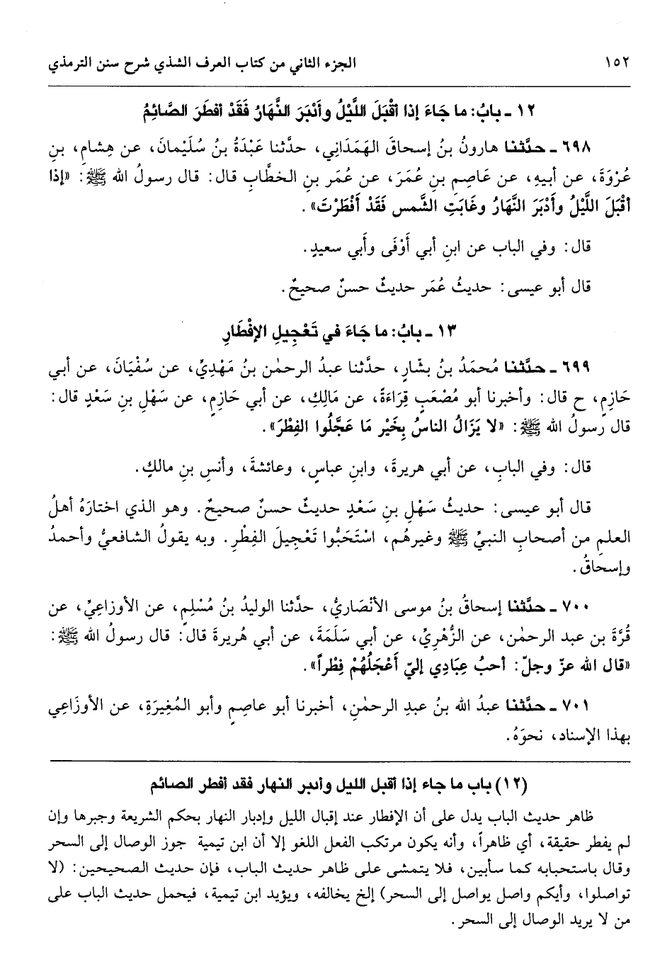 [698] ظاهر حديث الباب يدل على أن الإفطار عند إقبال الليل وإدبار النهار بحكم الشريعة وجبرها وإن لم يفطر حقيقة، أي ظاهراً، وأنه يكون مرتكب الفعل اللغو إلا أن ابن تيمية جوز الوصال إلى السحر وقال باستحبابه كما سأبين، فلا يتمشى على ظاهر حديث الباب، فإن حديث الصحيحين: (لا تواصلوا، وأيكم واصل يواصل إلى السحر) إلخ يخالفه، ويؤيد ابن تيمية، فيحمل حديث الباب على من لا يريد الوصال إلى السحر.