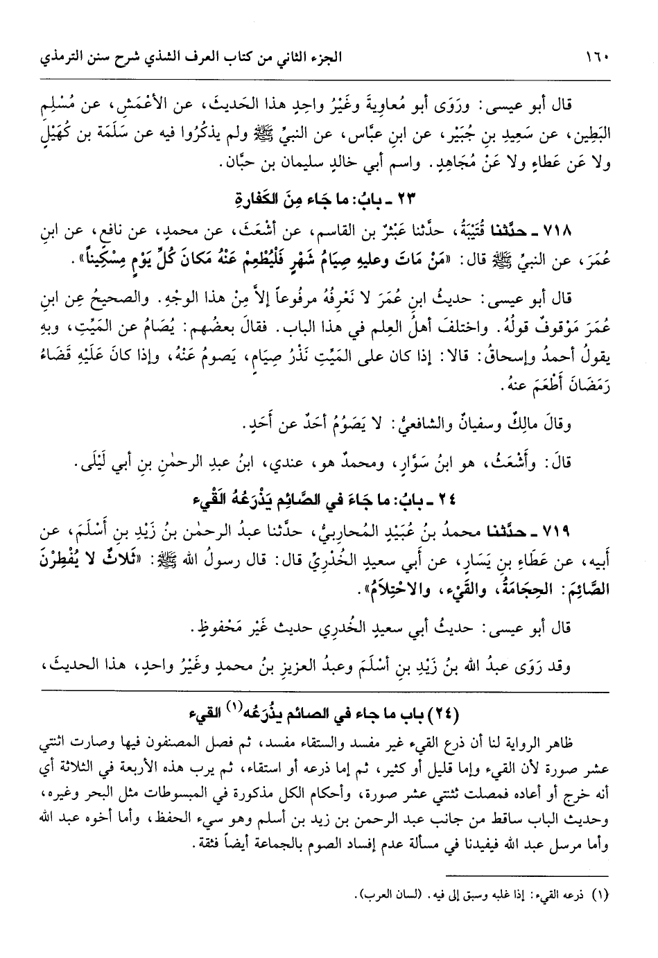 [719] ظاهر الرواية لنا أن ذرع القيء غير مفسد والستقاء مفسد، ثم فصل المصنفون فيها وصارت اثنتي عشر صورة لأن القيء وإما قليل أو كثير، ثم إما ذرعه أو استقاء، ثم يرب هذه الأربعة في الثلاثة أي أنه خرج أو أعاده فمصلت ثثنتي عشر صورة، وأحكام الكل مذكورة في المبسوطات مثل البحر وغيره، وحديث الباب ساقط من جانب عبد الرحمن بن زيد بن أسلم وهو سيء الحفظ، وأما أخوه عبد الله وأما مرسل عبد الله فيفيدنا في مسألة عدم إفساد الصوم بالجماعة أيضاً فثقة.