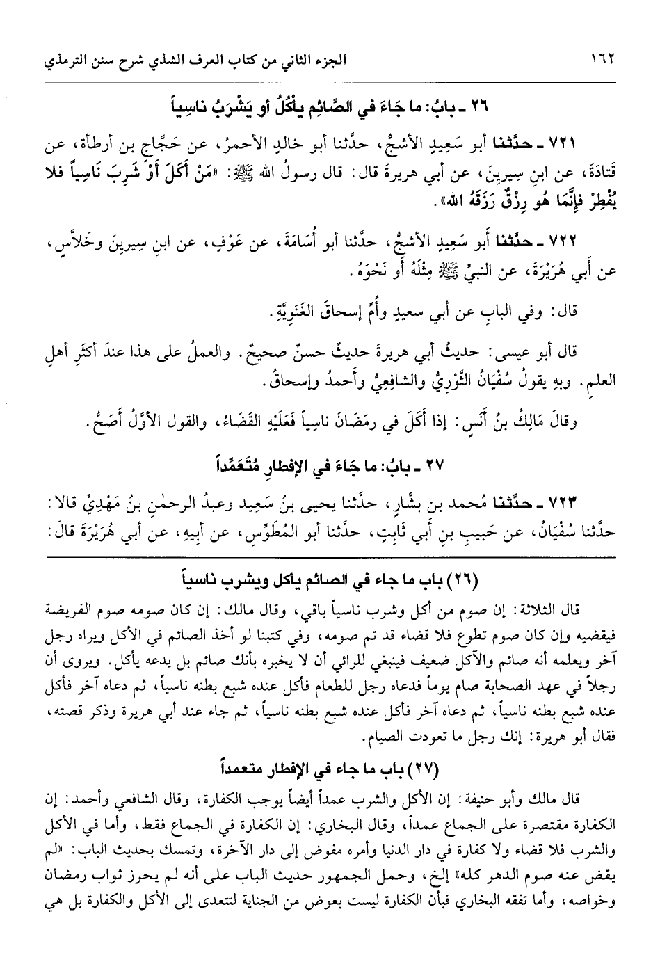 [721] قال الثلاثة: إن صوم من أكل وشرب ناسياً باقي، وقال مالك: إن كان صومه صوم الفريضة فيقضيه وإن كان صوم تطوع فلا قضاء قد تم صومه، وفي كتبنا لو أخذ الصائم في الأكل ويراه رجل آخر ويعلمه أنه صائم والآكل ضعيف فينبغي للرائي أن لا يخبره بأنك صائم بل يدعه يأكل. ويروى أن رجلاً في عهد الصحابة صام يوماً فدعاه رجل للطعام فأكل عنده شبع بطنه ناسياً، ثم دعاه آخر فأكل عنده شبع بطنه ناسياً، ثم دعاه آخر فأكل عنده شبع بطنه ناسياً، ثم جاء عند أبي هريرة وذكر قصته، فقال أبو هريرة: إنك رجل ما تعودت الصيام.