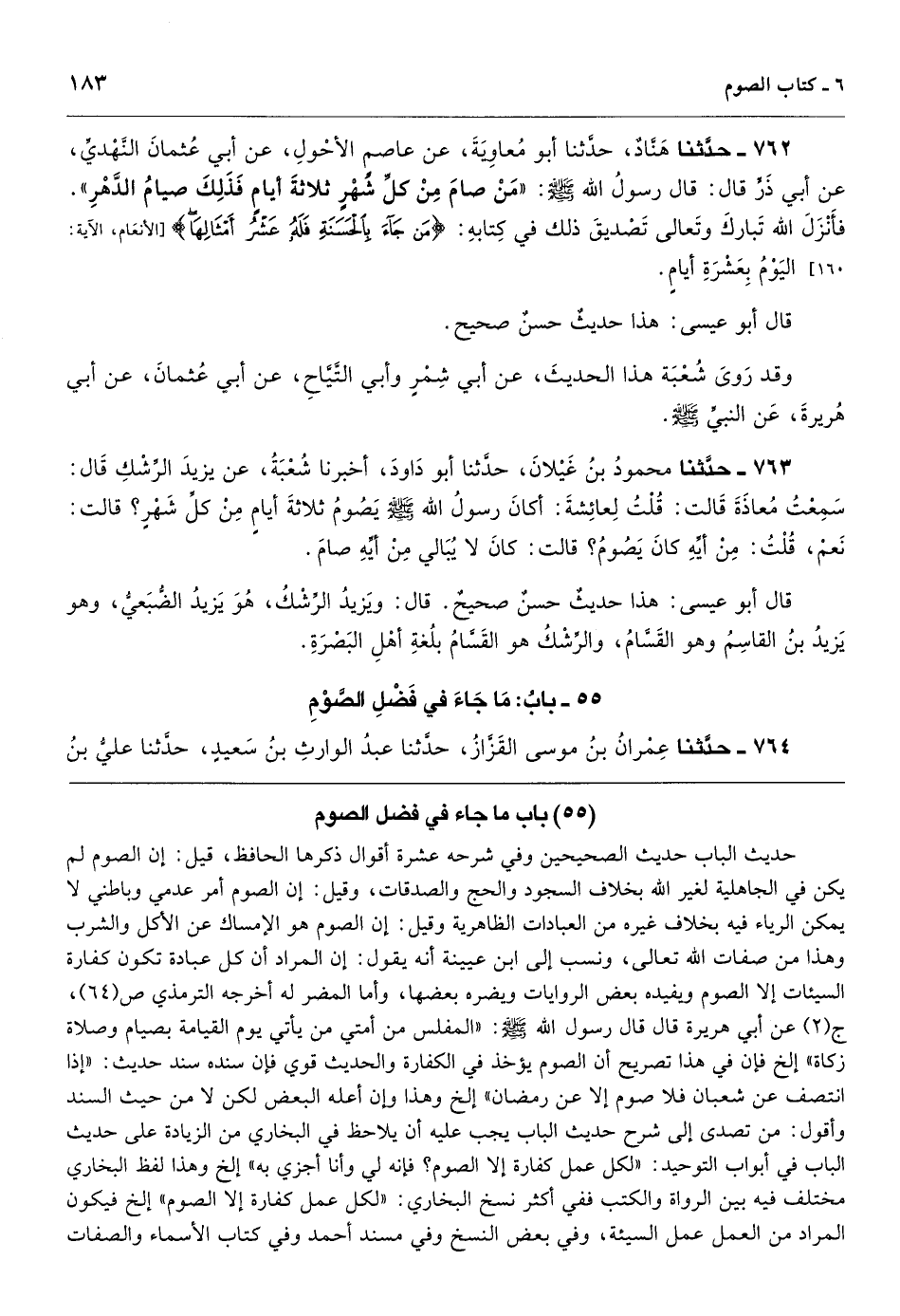 [764] حديث الباب حديث الصحيحين وفي شرحه عشرة أقوال ذكرها الحافظ، قيل: إن الصوم لم يكن في الجاهلية لغير الله بخلاف السجود والحج والصدقات، وقيل: إن الصوم أمر عدمي وباطني لا يمكن الرياء فيه بخلاف غيره من العبادات الظاهرية وقيل: إن الصوم هو الإمساك عن الأكل والشرب وهذا من صفات الله تعالى، ونسب إلى ابن عيينة أنه يقول: إن المراد أن كل عبادة تكون كفارة السيئات إلا الصوم ويفيده بعض الروايات ويضره بعضها، وأما المضر له أخرجه الترمذي ص (64) ، ج (2) عن أبي هريرة قال قال رسول الله - صَلَّى اللهُ عَلَيْهِ وَسَلَّمَ -: «المفلس من أمتي من يأتي يوم القيامة بصيام وصلاة زكاة» إلخ فإن في هذا تصريح أن الصوم يؤخذ في الكفارة والحديث قوي فإن سنده سند حديث: «إذا انتصف عن شعبان فلا صوم إلا عن رمضان» إلخ وهذا وإن أعله البعض لكن لا من حيث السند وأقول: من تصدى إلى شرح حديث الباب يجب عليه أن يلاحظ في البخاري من الزيادة على حديث الباب في أبواب التوحيد: «لكل عمل كفارة إلا الصوم؟ فإنه لي وأنا أجزي به» إلخ وهذا لفظ البخاري مختلف فيه بين الرواة والكتب ففي أكثر نسخ البخاري: «لكل عمل كفارة إلا الصوم» إلخ فيكون المراد من العمل عمل السيئة، وفي بعض النسخ وفي مسند أحمد وفي كتاب الأسماء والصفات