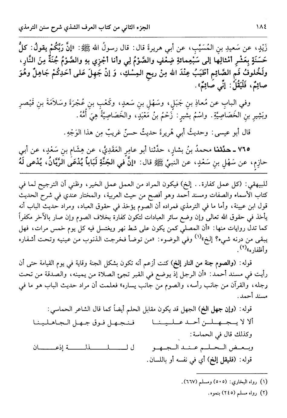 للبيهقي: (كل عمل كفارة. . إلخ) فيكون المراد من العمل عمل الخير، وظني أن الترجيح لما في كتاب الأسماء والصفات ومسند أحمد وهو أفصح من حيث العربية، والمختار عندي في شرح الحديث قول ابن عيينة، وأما ما في الترمذي فمراده أن الصوم يؤخذ في حقوق العباد، ومراد حديث الباب أنه يأخذ في حقوق الله تعالى وإن وضع سائر العبادات لتكون كفارة بخلاف الصوم وإن صار بالآخر مكفراً كما تدل روايات منها: «أن المصلي كمن يكون على شط نهر ويغتسل فيه كل يوم خمس مرات، فهل يبقى من درنه شيء؟ إلخ» وفي الوضوء: «من توضأ فخرجت الذنوب من عينيه وتحت أشفاره وأظفاره» .