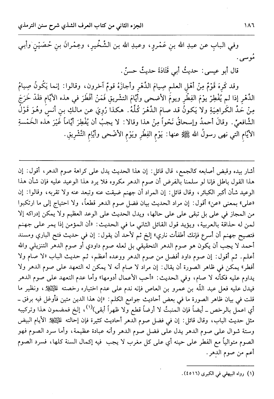 أشار بيده وقبض أصابعه كالجمع، قال قائل: إن هذا الحديث يدل على كراهة صوم الدهر، أقول: إن هذا القول باطل فإنا لو سلمنا بالفرض أن صوم الدهر مكروه فلا يرد هذا الوعيد عليه فإن شأن هذا الوعيد شأن أكبر الكبائر، وقال قائل: إن المراد أن جهنم ضيقت عنه وتبعد عنه ولا تقربه، وقالوا: إن «على» بمعنى «عن» أقول: إن مراد الحديث بيان فضل صوم الدهر قطعاً، ولا احتياج إلى ما ارتكبوا من المجاز في على بل تبقى على على حالها، ويدل الحديث على الوعد العظيم ولا يمكن إدراكه إلا لمن له حذاقة بالعربية، ويؤيد قول القائل الثاني ما في الحديث: «أن المؤمن إذا يمر على جهنم فتصيح جهنم أن أسرع فإنك أطفأت ناري» إلخ ثم لأحد أن يقول: إن في حديث فتح الباري ومسند أحمد لا يجب أن يكون هو صوم الدهر التحقيقي بل لعله صوم داودي أو صوم الدهر التنزيلي والله أعلم. ثم أقول: إن صوم داود أفضل من صوم الدهر ووعده أعظم، ثم حديث الباب «لا صام ولا أفطر» يمكن في ظاهر الصورة أن يقال: إن مراد لا صام أنه لا يمكن له التعهد على صوم الدهر ولا يداوم عليه فكأنه لا صام، وفي الحديث: «أحب الأعمال أدومها» وأما عدم التعهد على صوم الدهر فيدل عليه فعل عبد الله بن عمرو بن العاص فإنه ندم على عدم اختياره رخصته، ونظير ما قلت في بيان ظاهر الصورة ما في بعض أحاديث جوامع الكلم: «إن هذا الدين متين فأوغل فيه برفق ـ أي اعمل بالرخص ـ أيضاً فإن المنبتَّ لا أرضاً قطع ولا ظهراً أبقى» ، إلخ فمضمون هذا وتركيبه مثل حديث الباب، وقال قائل: إن في فضل صوم الدهر أحاديث كثيرة فإن إحالته الأيام البيض وستة شوال على صوم الدهر يدل على فضل صوم الدهر وأنه عبادة عظيمة، وأما سرد الصوم فهو الصوم متوالياً مع الفطر على حينه أي على كل مغرب لا يجب فيه إكمال السنة كلها، فسرد الصوم أعم من صوم الدهر.