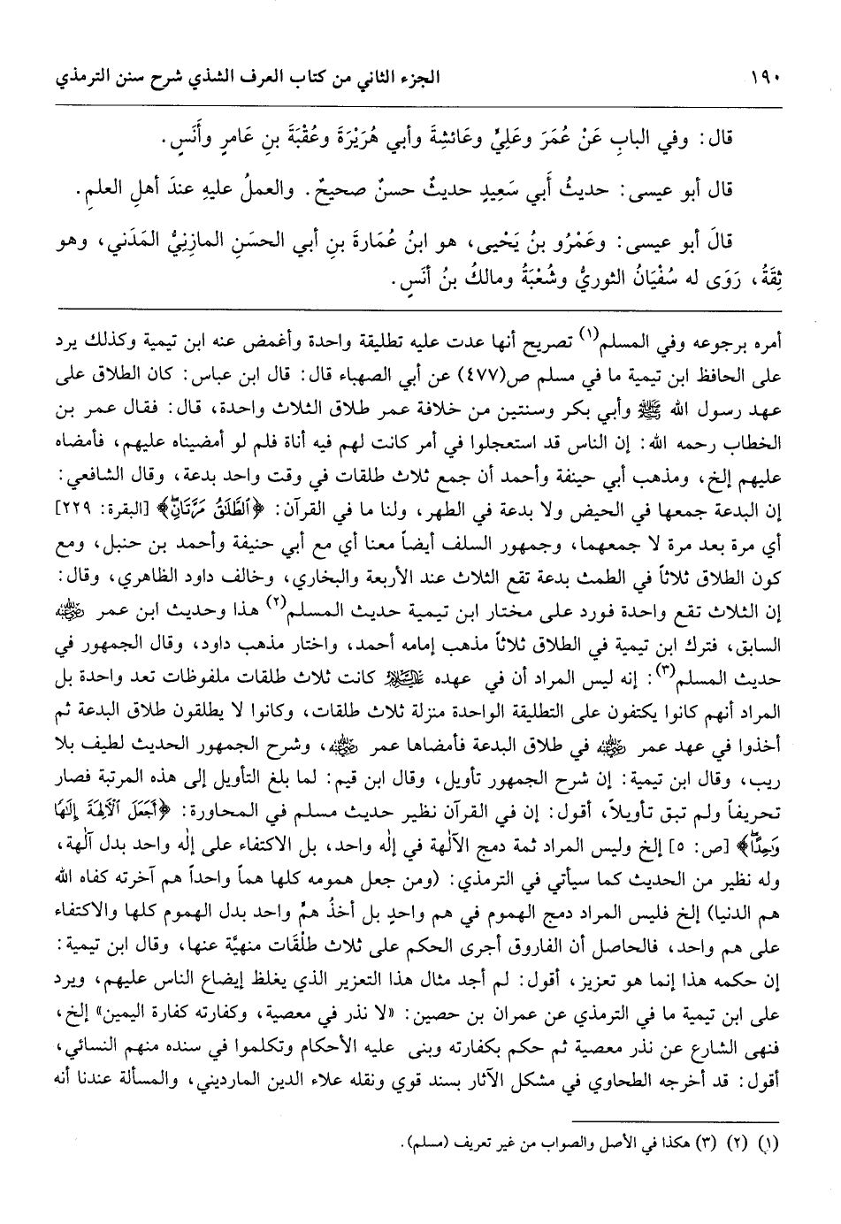 فليس المراد دمج الهموم في هم واحدٍ بل أخذُ همٍّ واحد بدل الهموم كلها والاكتفاء على هم واحد، فالحاصل أن الفاروق أجرى الحكم على ثلاث طلْقَات منهيَّة عنها، وقال ابن تيمية: إن حكمه هذا إنما هو تعزيز، أقول: لم أجد مثال هذا التعزير الذي يغلظ إيضاع الناس عليهم، ويرد على ابن تيمية ما في الترمذي عن عمران بن حصين: «لا نذر في معصية، وكفارته كفارة اليمين» إلخ، فنهى الشارع عن نذر معصية ثم حكم بكفارته وبنى عليه الأحكام وتكلموا في سنده منهم النسائي، أقول: قد أخرجه الطحاوي في مشكل الآثار بسند قوي ونقله علاء الدين المارديني، والمسألة عندنا أنه