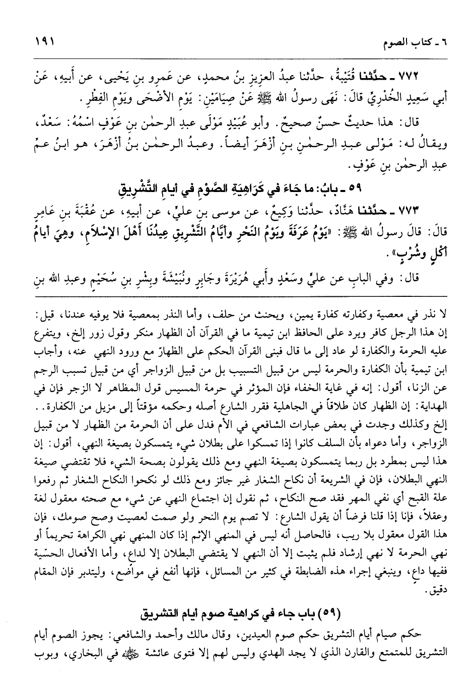 [773] حكم صيام أيام التشريق حكم صوم العيدين، وقال مالك وأحمد والشافعي: يجوز الصوم أيام التشريق للمتمتع والقارن الذي لا يجد الهدي وليس لهم إلا فتوى عائشة في البخاري، وبوب