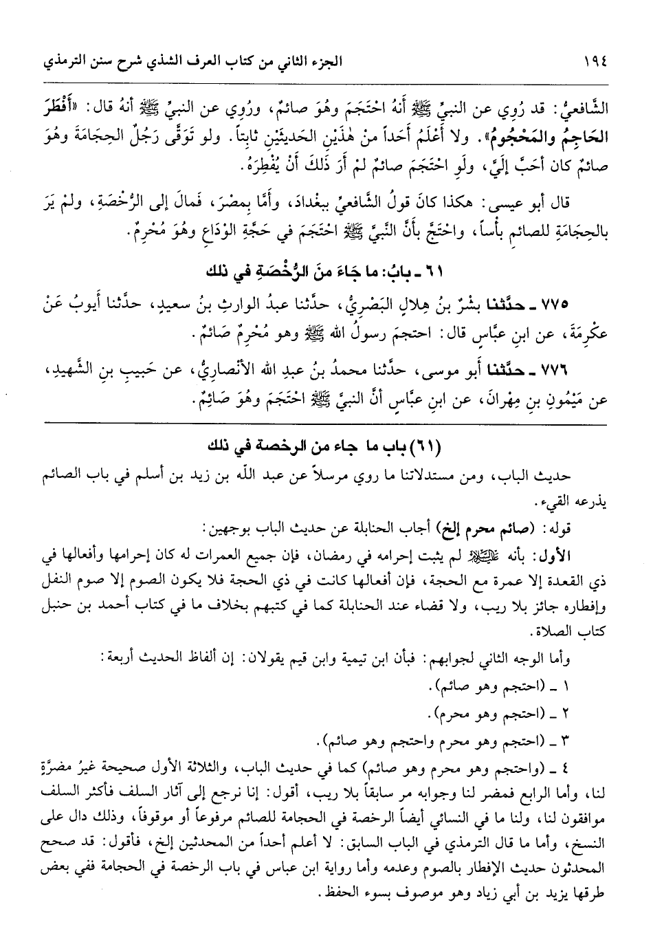 4 ـ (واحتجم وهو محرم وهو صائم) كما في حديث الباب، والثلاثة الأول صحيحة غيرُ مضرَّةٍ لنا، وأما الرابع فمضر لنا وجوابه مر سابقاً بلا ريب، أقول: إنا نرجع إلى آثار السلف فأكثر السلف موافقون لنا، ولنا ما في النسائي أيضاً الرخصة في الحجامة للصائم مرفوعاً أو موقوفاً، وذلك دال على النسخ، وأما ما قال الترمذي في الباب السابق: لا أعلم أحداً من المحدثين إلخ، فأقول: قد صحح المحدثون حديث الإفطار بالصوم وعدمه وأما رواية ابن عباس في باب الرخصة في الحجامة ففي بعض طرقها يزيد بن أبي زياد وهو موصوف بسوء الحفظ.