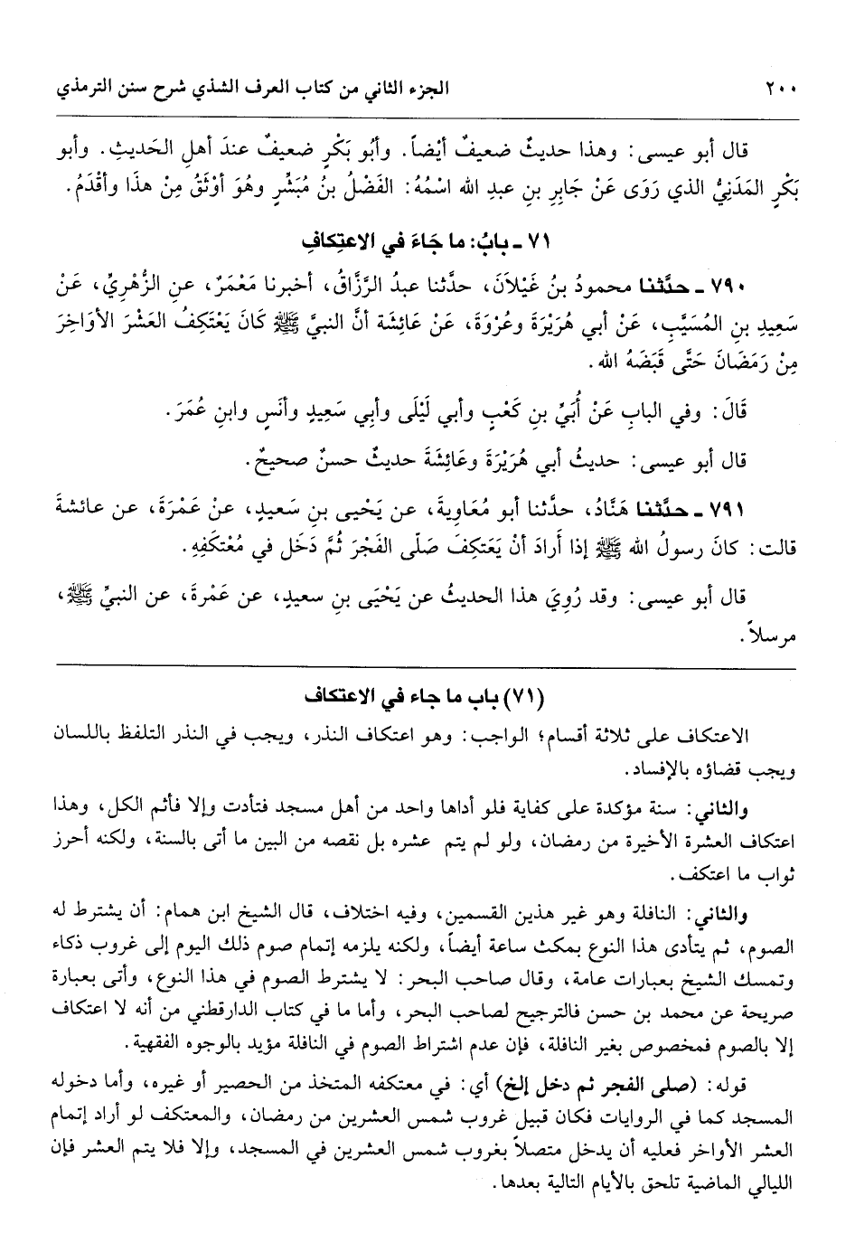 [790] الاعتكاف على ثلاثة أقسام؛ الواجب: وهو اعتكاف النذر، ويجب في النذر التلفظ باللسان ويجب قضاؤه بالإفساد.