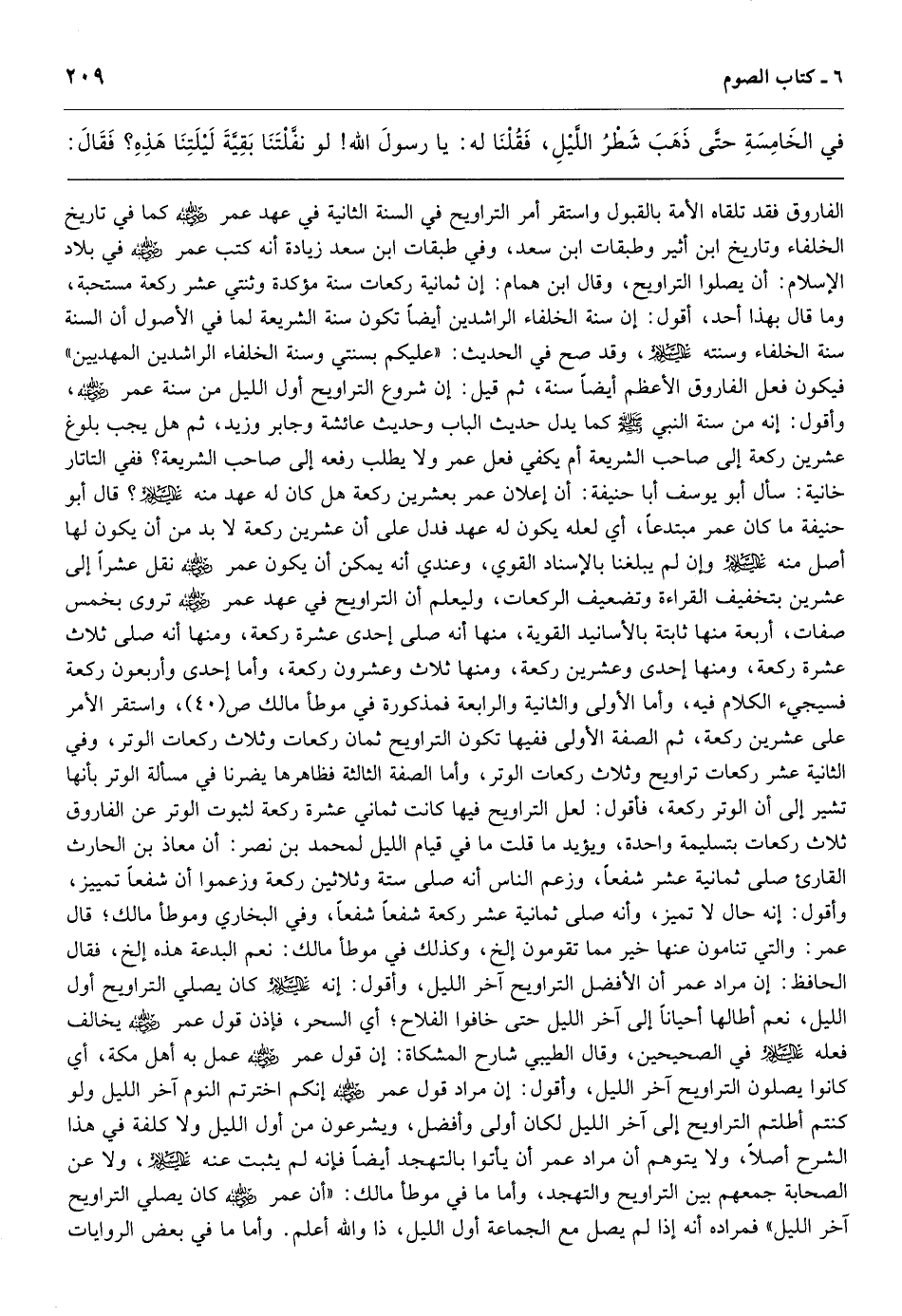 الفاروق فقد تلقاه الأمة بالقبول واستقر أمر التراويح في السنة الثانية في عهد عمر كما في تاريخ الخلفاء وتاريخ ابن أثير وطبقات ابن سعد، وفي طبقات ابن سعد زيادة أنه كتب عمر في بلاد الإسلام: أن يصلوا التراويح، وقال ابن همام: إن ثمانية ركعات سنة مؤكدة وثنتي عشر ركعة مستحبة، وما قال بهذا أحد، أقول: إن سنة الخلفاء الراشدين أيضاً تكون سنة الشريعة لما في الأصول أن السنة سنة الخلفاء وسنته، وقد صح في الحديث: «عليكم بسنتي وسنة الخلفاء الراشدين المهديين» فيكون فعل الفاروق الأعظم أيضاً سنة، ثم قيل: إن شروع التراويح أول الليل من سنة عمر، وأقول: إنه من سنة النبي - صَلَّى اللهُ عَلَيْهِ وَسَلَّمَ - كما يدل حديث الباب وحديث عائشة وجابر وزيد، ثم هل يجب بلوغ عشرين ركعة إلى صاحب الشريعة أم يكفي فعل عمر ولا يطلب رفعه إلى صاحب الشريعة؟ ففي التاتار خانية: سأل أبو يوسف أبا حنيفة: أن إعلان عمر بعشرين ركعة هل كان له عهد منه؟ قال أبو حنيفة ما كان عمر مبتدعاً، أي لعله يكون له عهد فدل على أن عشرين ركعة لا بد من أن يكون لها أصل منه وإن لم يبلغنا بالإسناد القوي، وعندي أنه يمكن أن يكون عمر نقل عشراً إلى عشرين بتخفيف القراءة وتضعيف الركعات، وليعلم أن التراويح في عهد عمر تروى بخمس صفات، أربعة منها ثابتة بالأسانيد القوية، منها أنه صلى إحدى عشرة ركعة، ومنها أنه صلى ثلاث عشرة ركعة، ومنها إحدى وعشرين ركعة، ومنها ثلاث وعشرون ركعة، وأما إحدى وأربعون ركعة فسيجيء الكلام فيه، وأما الأولى والثانية والرابعة فمذكورة في موطأ مالك ص (40) ، واستقر الأمر على عشرين ركعة، ثم الصفة الأولى ففيها تكون التراويح ثمان ركعات وثلاث ركعات الوتر، وفي الثانية عشر ركعات تراويح وثلاث ركعات الوتر، وأما الصفة الثالثة فظاهرها يضرنا في مسألة الوتر بأنها تشير إلى أن الوتر ركعة، فأقول: لعل التراويح فيها كانت