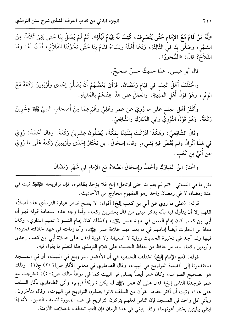 قوله: (على ما روي عن أبي بن كعب إلخ) أقول: لا يصح ظاهر عبارة الترمذي هذه أصلاً، اللهم إلا أن يتأول فيه بأنه يذكر مبنى من قال بعشرين ركعة، وأما وجه عدم استقامة قوله فهو أن أبي بن كعب كان إمام الناس في عهد عمر، وكذلك كان إمام النسوان تميم الداري، وكان معاذ بن الحارث أيضاً إمامهم في ما بعد عهد خلافة عمر، وأما إمامته في عهد خلافته فمترددة فيها ولم أجد في ذخيرة الحديث رواية لا ضعيفة ولا قوية لتدل على صلاة أبي بن كعب إحدى وأربعين ركعة، وما مر حافظ من حفاظ الحديث على كلام الترمذي هذا لنعلم ما يقول فيه.