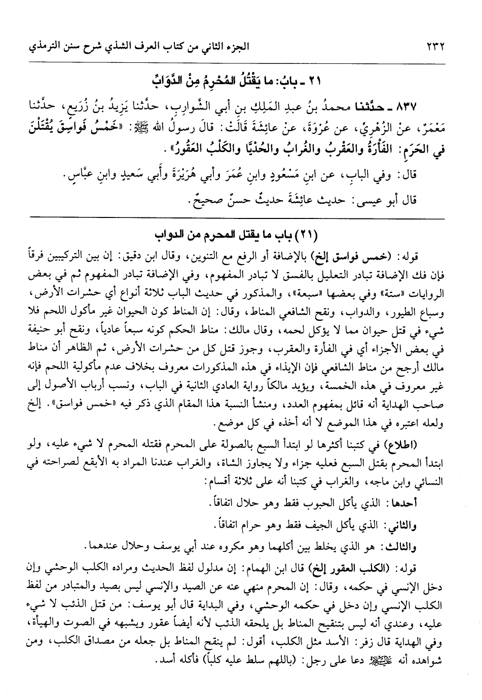 [837] قوله: (خمس فواسق إلخ) بالإضافة أو الرفع مع التنوين، وقال ابن دقيق: إن بين التركيبين فرقاً فإن فك الإضافة تبادر التعليل بالفسق لا تبادر المفهوم، وفي الإضافة تبادر المفهوم ثم في بعض الروايات «ستة» وفي بعضها «سبعة» ، والمذكور في حديث الباب ثلاثة أنواع أي حشرات الأرض، وسباع الطيور، والدواب، ونقح الشافعي المناط، وقال: إن المناط كون الحيوان غير مأكول اللحم فلا شيء في قتل حيوان مما لا يؤكل لحمه، وقال مالك: مناط الحكم كونه سبعاً عادياً، ونقح أبو حنيفة في بعض الأجزاء أي في الفأرة والعقرب، وجوز قتل كل من حشرات الأرض، ثم الظاهر أن مناط مالك أرجح من مناط الشافعي فإن الإيذاء في هذه المذكورات معروف بخلاف عدم مأكولية اللحم فإنه غير معروف في هذه الخمسة، ويؤيد مالكاً رواية العادي الثانية في الباب، ونسب أرباب الأصول إلى صاحب الهداية أنه قائل بمفهوم العدد، ومنشأ النسبة هذا المقام الذي ذكر فيه «خمس فواسق» . إلخ ولعله اعتبره في هذا الموضع لا أنه أخذه في كل موضع.