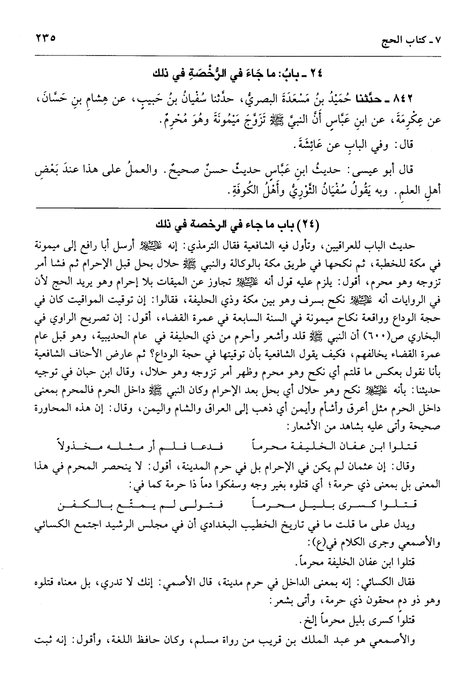 [842] حديث الباب للعراقيين، وتأول فيه الشافعية فقال الترمذي: إنه أرسل أبا رافع إلى ميمونة في مكة للخطبة، ثم نكحها في طريق مكة بالوكالة والنبي - صَلَّى اللهُ عَلَيْهِ وَسَلَّمَ - حلال بحل قبل الإحرام ثم فشا أمر تزوجه وهو محرم، أقول: يلزم عليه قول أنه تجاوز عن الميقات بلا إحرام وهو يريد الحج لأن في الروايات أنه نكح بسرف وهو بين مكة وذي الحليفة، فقالوا: إن توقيت المواقيت كان في حجة الوداع وواقعة نكاح ميمونة في السنة السابعة في عمرة القضاء، أقول: إن تصريح الراوي في البخاري ص (600) أن النبي - صَلَّى اللهُ عَلَيْهِ وَسَلَّمَ - قلد وأشعر وأحرم من ذي الحليفة في عام الحديبية، وهو قبل عام عمرة القضاء يخالفهم، فكيف يقول الشافعية بأن توقيتها في حجة الوداع؟ ثم عارض الأحناف الشافعية بأنا نقول بعكس ما قلتم أي نكح وهو محرم وظهر أمر تزوجه وهو حلال، وقال ابن حبان في توجيه حديثنا: بأنه نكح وهو حلال أي بحل بعد الإحرام وكان النبي - صَلَّى اللهُ عَلَيْهِ وَسَلَّمَ - داخل الحرم فالمحرم بمعنى داخل الحرم مثل أعرق وأشأم وأيمن أي ذهب إلى العراق والشام واليمن، وقال: إن هذه المحاورة صحيحة وأتى عليه بشاهد من الأشعار: