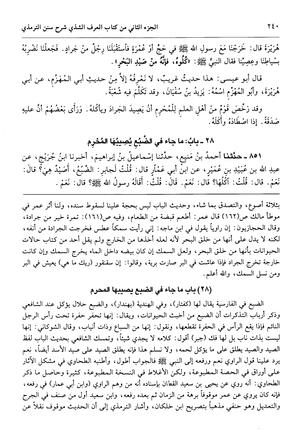 [851] الضبع في الفارسية يقال لها (كفتار) ، وفي الهندية (بهندار) ، والضبع حلال يؤكل عند الشافعي وذكر أرباب التذكرات أن الضبع من أخبث الحيوانات، ويقال: إنها تحفر حفرة تحت رأس الرجل النائم فإذا يقع الرأس في الحفرة تقطعها، ونقول: إنها من السباع وذات أنياب، وقال الشوكاني: إنها ليست بذات ناب بل لها فك (جبر) أقول: كلامه لا يجدي شيئاً، وتمسك الشافعي بحديث الباب لفظ الصيد والصيد يطلق على ما يؤكل لحمه، ولا نسلم هذا فإنه يطلق الصيد على صيد الأسد أيضاً، نعم يرد علينا قول الراوي نعم ورفعه إلى النبي - صَلَّى اللهُ عَلَيْهِ وَسَلَّمَ - فالجواب أطول، وأطنبه الطحاوي في مشكل الآثار على أوراق في الحصة المطبوعة، ولكن الأغلاط في النسخة المطبوعة، كثيرة وحاصل ما ذكر الطحاوي: أنه روي عن يحيى بن سعيد القطان بإسناده أنه من وهم الراوي (وابن أبي عمار) في رفعه، فإنه كان يروي عن عمر موقوفاً برهة من الزمان ثم بعده رفعه، وابن سعيد أول من صنف في الجرح والتعديل وهو حنفي مذهباً بتصريح ابن خلكان، وأشار الترمذي إلى أن الحديث موقوف نقلاً عن