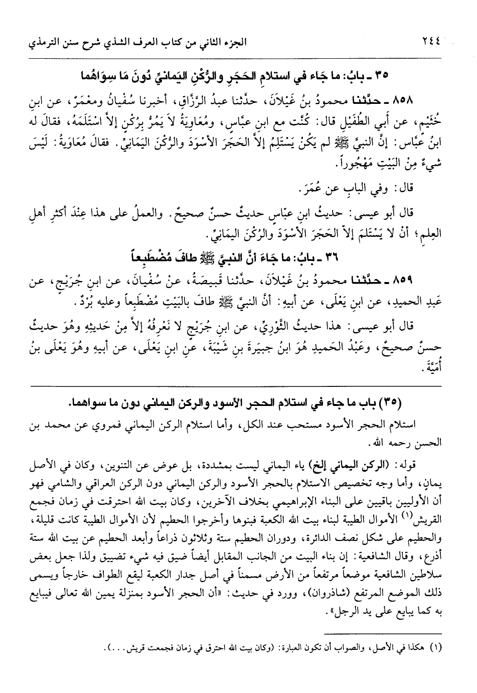 قوله: (الركن اليماني إلخ) ياء اليماني ليست بمشددة، بل عوض عن التنوين، وكان في الأصل يمانٍ، وأما وجه تخصيص الاستلام بالحجر الأسود والركن اليماني دون الركن العراقي والشامي فهو أن الأوليين باقيين على البناء الإبراهيمي بخلاف الآخرين، وكان بيت الله احترقت في زمان فجمع القريش الأموال الطيبة لبناء بيت الله الكعبة فبنوها وأخرجوا الحطيم لأن الأموال الطيبة كانت قليلة، والحطيم على شكل نصف الدائرة، ودوران الحطيم ستة وثلاثون ذراعاً وأبعد الحطيم عن بيت الله ستة أذرع، وقال الشافعية: إن بناء البيت من الجانب المقابل أيضاً ضيق فيه شيء تضييق ولذا جعل بعض سلاطين الشافعية موضعاً مرتفعاً من الأرض مسمناً في أصل جدار الكعبة ليقع الطواف خارجاً ويسمى ذلك الموضع المرتفع (شاذروان) ، وورد في حديث: «أن الحجر الأسود بمنزلة يمين الله تعالى فيبايع به كما يبايع على يد الرجل» .