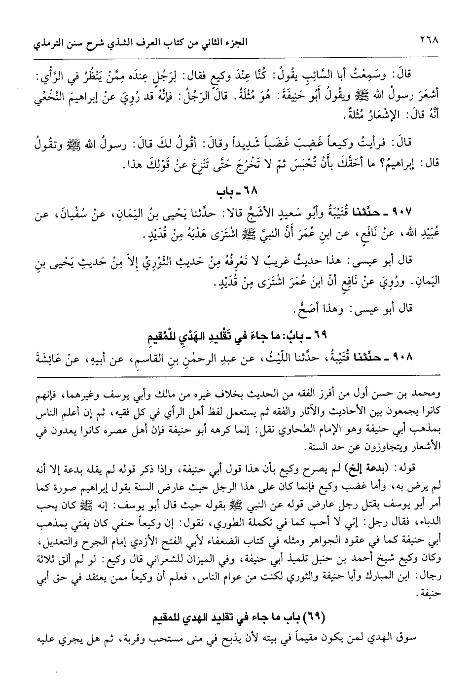 قوله: (بدعة إلخ) لم يصرح وكيع بأن هذا قول أبي حنيفة، وإذا ذكر قوله لم يقله بدعة إلا أنه لم يرض به، وأما غضب وكيع فإنما كان على هذا الرجل حيث عارض السنة بقول إبراهيم صورة كما أمر أبو يوسف بقتل رجل عارض قوله عن النبي - صَلَّى اللهُ عَلَيْهِ وَسَلَّمَ - بقوله حيث قال أبو يوسف: إنه - صَلَّى اللهُ عَلَيْهِ وَسَلَّمَ - كان يحب الدباء، فقال رجل: إني لا أحب كما في تكملة الطوري، نقول: إن وكيعاً حنفي كان يفتي بمذهب أبي حنيفة كما في عقود الجواهر ومثله في كتاب الضعفاء لأبي الفتح الأزدي إمام الجرح والتعديل، وكان وكيع شيخ أحمد بن حنبل تلميذ أبي حنيفة، وفي الميزان للشعراني قال وكيع: لو لم ألق ثلاثة رجال: ابن المبارك وأبا حنيفة والثوري لكنت من عوام الناس، فعلم أن وكيعاً ممن يعتقد في حق أبي حنيفة.