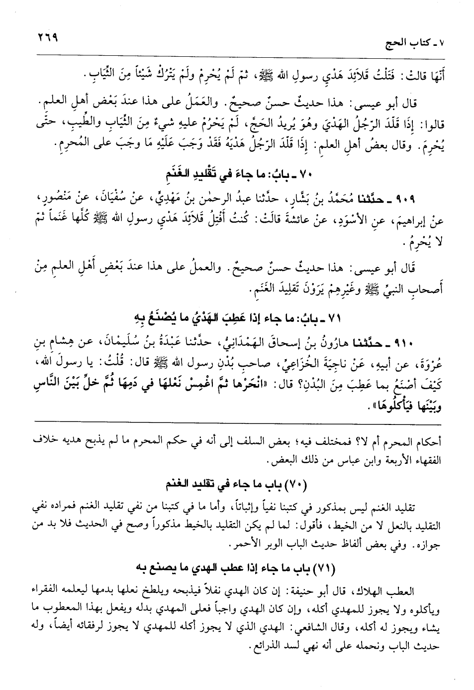 [909] تقليد الغنم ليس بمذكور في كتبنا نفياً وإثباتاً، وأما ما في كتبنا من نفي تقليد الغنم فمراده نفي التقليد بالنعل لا من الخيط، فأقول: لما لم يكن التقليد بالخيط مذكوراً وصح في الحديث فلا بد من جوازه. وفي بعض ألفاظ حديث الباب الوبر الأحمر.