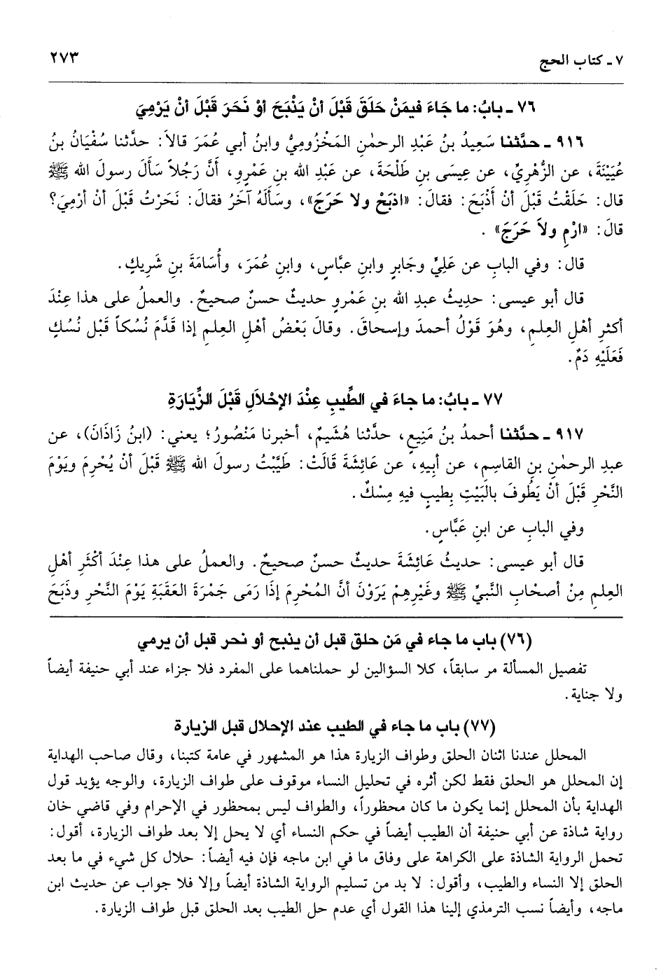 [917] المحلل عندنا اثنان الحلق وطواف الزيارة هذا هو المشهور في عامة كتبنا، وقال صاحب الهداية إن المحلل هو الحلق فقط لكن أثره في تحليل النساء موقوف على طواف الزيارة، والوجه يؤيد قول الهداية بأن المحلل إنما يكون ما كان محظوراً، والطواف ليس بمحظور في الإحرام وفي قاضي خان رواية شاذة عن أبي حنيفة أن الطيب أيضاً في حكم النساء أي لا يحل إلا بعد طواف الزيارة، أقول: تحمل الرواية الشاذة على الكراهة على وفاق ما في ابن ماجه فإن فيه أيضاً: حلال كل شيء في ما بعد الحلق إلا النساء والطيب، وأقول: لا بد من تسليم الرواية الشاذة أيضاً وإلا فلا جواب عن حديث ابن ماجه، وأيضاً نسب الترمذي إلينا هذا القول أي عدم حل الطيب بعد الحلق قبل طواف الزيارة.