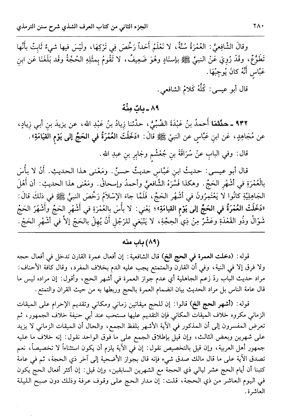 [932] قوله: (دخلت العمرة في الحج الخ) قال الشافعية: إن أفعال عمرة القارن تدخل في أفعال حجه ولا فرق إلا في النية، وفي أن القارن والمتمتع يجب عليه الدم بخلاف المفرد، وقال كافة الأحناف: مراد حديث الباب ردّ زعم الجاهلية أي عدم جواز العمرة في أشهر الحج، وأقول: إن مراده ليس ما قال عامة الناس بل مراد الحديث بيان انضمام العمرة بالحج وربطها به من حيث القران والتمتع.