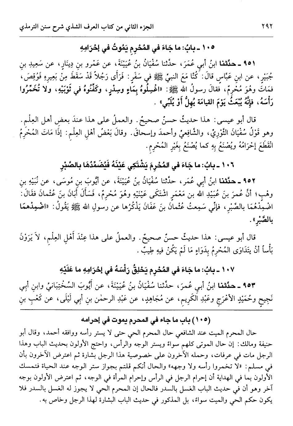 [951] حال المحرم الميت عند الشافعي حال المحرم الحي حتى لا يستر رأسه ووافقه أحمد، وقال أبو حنيفة ومالك: إن حال الموتى كلهم سواءٌ ويستر الوجه والرأس، واحتج الأولون بحديث الباب وهذا الرجل مات في عرفات، وحمله الآخرون على خصوصية هذا الرجل بشارة ثم اعترض الآخرون بأن في مسلم: «لا تخمروا رأسه ولا وجهه» والحال أنكم قلتم بجواز ستر الوجه عند الحياة فتمسك الأولون بما في الهداية أن إحرام الرجل في الرأس وإحرام المرأة في الوجه، ثم اعترض الأولون بوجه آخر وهو أن في حديث الباب الغسل بالسدر فالحال إن المحرم الحي لا يجوز له الغسل بالسدر فلا يكون حكم الحي والميت سواءً، بل المذكور في حديث الباب البشارة لهذا الرجل وخاص به.