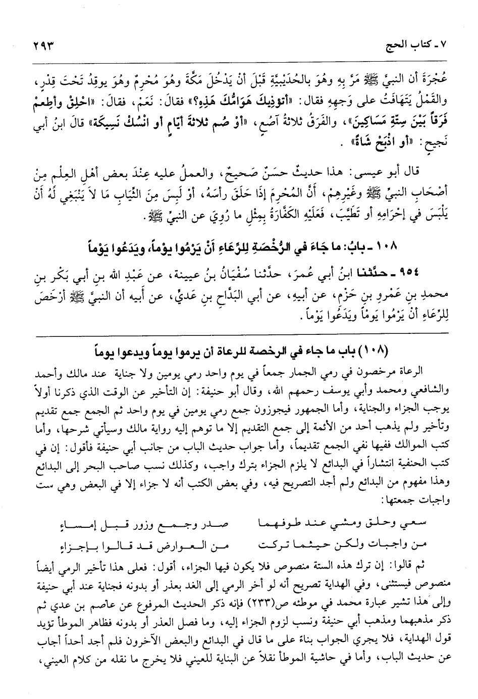 [954] الرعاة مرخصون في رمي الجمار جمعاً في يوم واحد رمي يومين ولا جناية عند مالك وأحمد والشافعي ومحمد وأبي يوسف رحمهم الله، وقال أبو حنيفة: إن التأخير عن الوقت الذي ذكرنا أولاً يوجب الجزاء والجناية، وأما الجمهور فيجوزون جمع رمي يومين في يوم واحد ثم الجمع جمع تقديم وتأخير ولم يذهب أحد من الأئمة إلى جمع التقديم إلا ما توهم إليه رواية مالك وسيأتي شرحها، وأما كتب الموالك ففيها نفي الجمع تقديماً، وأما جواب حديث الباب من جانب أبي حنيفة فأقول: إن في كتب الحنفية انتشاراً في البدائع لا يلزم الجزاء بترك واجب، وكذلك نسب صاحب البحر إلى البدائع وهذا مفهوم من البدائع ولم أجد التصريح فيه، وفي بعض الكتب أنه لا جزاء إلا في البعض وهي ست واجبات جمعتها: