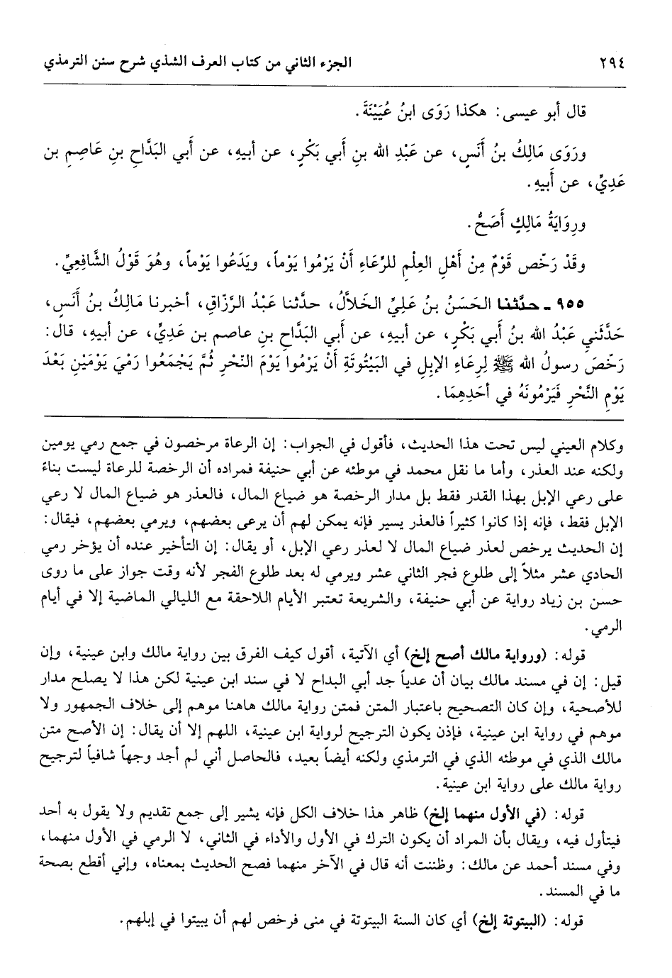 قوله: (ورواية مالك أصح إلخ) أي الآتية، أقول كيف الفرق بين رواية مالك وابن عينية، وإن قيل: إن في مسند مالك بيان أن عدياً جد أبي البداح لا في سند ابن عينية لكن هذا لا يصلح مدار للأصحية، وإن كان التصحيح باعتبار المتن فمتن رواية مالك هاهنا موهم إلى خلاف الجمهور ولا موهم في رواية ابن عينية، فإذن يكون الترجيح لرواية ابن عينية، اللهم إلا أن يقال: إن الأصح متن مالك الذي في موطئه الذي في الترمذي ولكنه أيضاً بعيد، فالحاصل أني لم أجد وجهاً شافياً لترجيح رواية مالك على رواية ابن عينية.