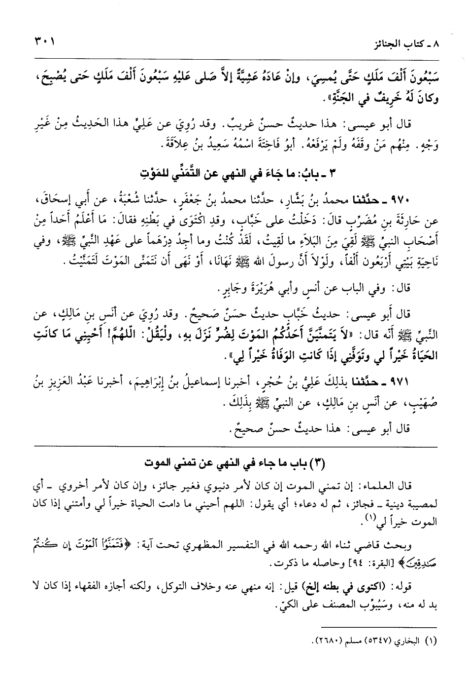 [970] قال العلماء: إن تمني الموت إن كان لأمر دنيوي فغير جائز، وإن كان لأمر أخروي ـ أي لمصيبة دينية ـ فجائز، ثم له دعاء؛ أي يقول: اللهم أحيني ما دامت الحياة خيراً لي وأمتني إذا كان الموت خيراً لي.