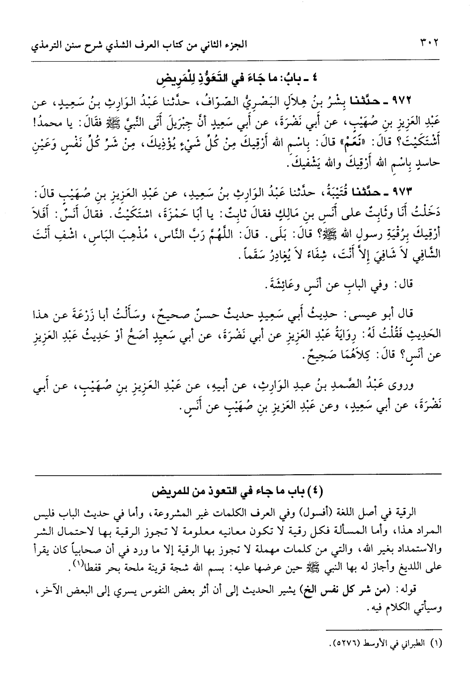 [972] الرقية في أصل اللغة (أفسول) وفي العرف الكلمات غير المشروعة، وأما في حديث الباب فليس المراد هذا، وأما المسألة فكل رقية لا تكون معانيه معلومة لا تجوز الرقية بها لاحتمال الشر والاستمداد بغير الله، والتي من كلمات مهملة لا تجوز بها الرقية إلا ما ورد في أن صحابياً كان يقرأ على اللديغ وأجاز له بها النبي - صَلَّى اللهُ عَلَيْهِ وَسَلَّمَ - حين عرضها عليه: بسم الله شجة قرينة ملحة بحر قفطا.