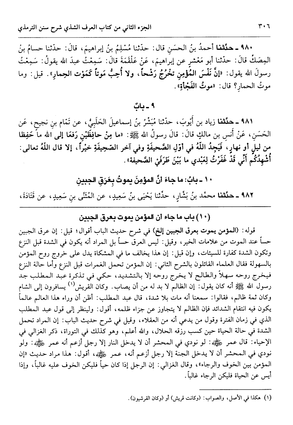 [982] قوله: (المؤمن يموت بعرق الجبين إلخ) في شرح حديث الباب أقوال؛ قيل: إن عرق الجبين حساً عند الموت من علامات الخير، وقيل: ليس العرق حساً بل المراد أنه يكون في الشدة قبل النزع وتكون الشدة كفارة للسيئات، وإن قيل: إن هذا يخالف ما في المشكاة يدل على خروج روح المؤمن بالسهولة فقال العلماء القائلون بالشرح الثاني: إن المؤمن تحمل الغمرات قبل النزع وأما حالة النزع فيخرج روحه سهلاً والطالح لا يخرج روحه إلا بالتشديد، حكي في تذكرة عبد المطلب جد رسول الله - صَلَّى اللهُ عَلَيْهِ وَسَلَّمَ - أنه كان يقول: إن الظالم لا بد له من أن يصاب. وكان القريش يسافرون إلى الشام وكان ثمة ظالم، فقالوا: سمعنا أنه مات بلا شدة، قال عبد المطلب: أظن أن وراء هذا العالم عالماً يكون فيه انتقام الشدائد فإن الظالم لا يتجاوز عن جزاء ظلمه، أقول: ولينظر إلى قول عبد المطلب الذي في زمان الفترة وقول من يدعي أنه من العقلاء، وقيل في شرح حديث الباب: إن المراد تحمل الشدة في حالة الحياة حين كسب رزقه الحلال، والله أعلم، وهو كذلك في التوراة، ذكر الغزالي في الإحياء: قال عمر: لو نودي في المحشر أن لا يدخل النار إلا رجل أزعم أنه عمر: ولو نودي في المحشر أن لا يدخل الجنة إلا رجل أزعم أنه، عمر، أقول: هذا مراد حديث «إن المؤمن بين الخوف والرجاء» ، وقال الغزالي: إن الرجل إذا كان حياً فليكن الخوف عليه غالباً، وإذا أيس عن الحياة فليكن الرجاء غالباً.