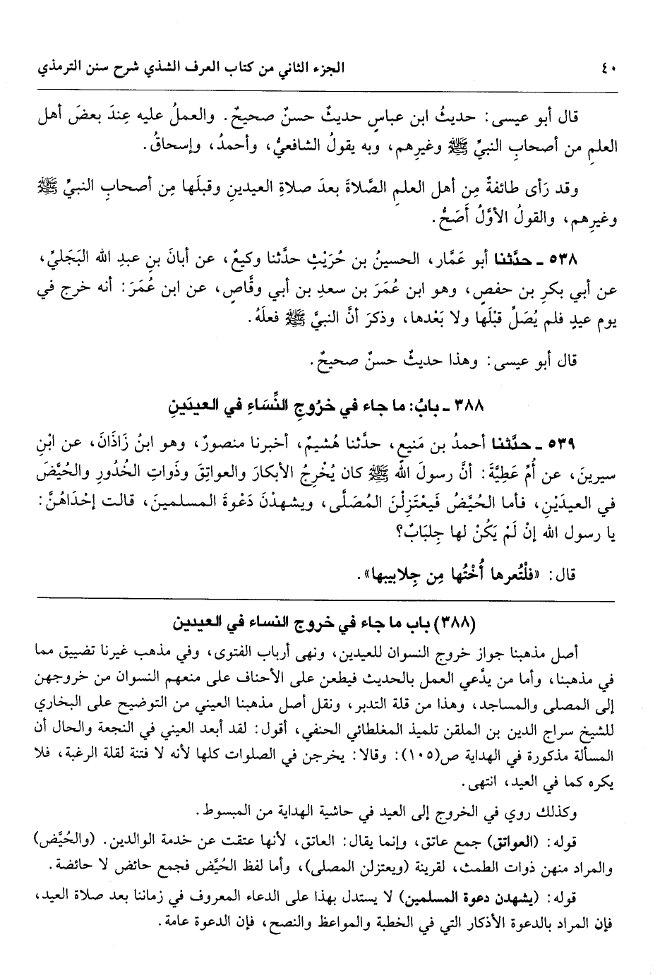 [539] أصل مذهبنا جواز خروج النسوان للعيدين، ونهى أرباب الفتوى، وفي مذهب غيرنا تضييق مما في مذهبنا، وأما من يدَّعي العمل بالحديث فيطعن على الأحناف على منعهم النسوان من خروجهن إلى المصلى والمساجد، وهذا من قلة التدبر، ونقل أصل مذهبنا العيني من التوضيح على البخاري للشيخ سراج الدين بن الملقن تلميذ المغلطائي الحنفي، أقول: لقد أبعد العيني في النجعة والحال أن المسألة مذكورة في الهداية ص (105) : وقالا: يخرجن في الصلوات كلها لأنه لا فتنة لقلة الرغبة، فلا يكره كما في العيد، انتهى.