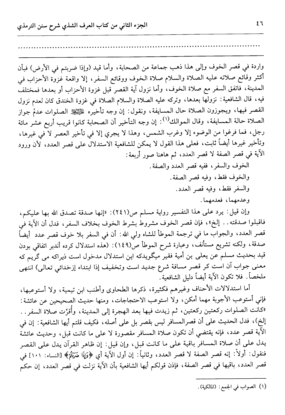 وإن قيل: يرد على هذا التفسير رواية مسلم ص (241) : «إنها صدقة تصدق الله بها عليكم، فاقبلوا صدقته. . إلخ» ، فإن قصر الخوف مشروط بشرط الخوف بخلاف السفر، فدل أن الآية في قصر العدد، والجواب ما في ترجمة الموطأ للشاه ولي الله: أن في السفر بلا خوف قصر عدد أيضاً صدقة، ولكنه تشريع مستأنف، وعبارة شرح الموطأ ص (149) : (هذه استدلال كرده أندبر اتفاقي بودن قيد بحديث مسلم عن يعلى بن أمية فقير ميگويدكه اين استدلال مدخول است ذيراكه مى گريم كه معنى جواب آن است كر قصر مسافة شرع جديد است وتخفيف إذا ابتداء إزخدائي تعالى) انتهى ملخصاً. فلا تكون الآية أيضاً دليل الشافعية.
