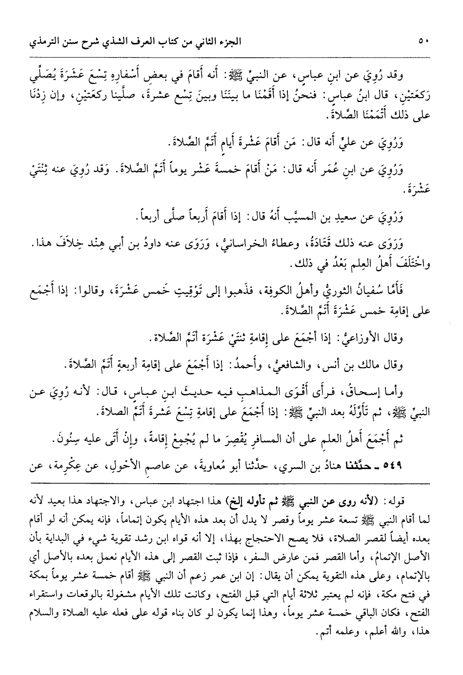 قوله: (لأنه روى عن النبي - صَلَّى اللهُ عَلَيْهِ وَسَلَّمَ - ثم تأوله إلخ) هذا اجتهاد ابن عباس، والاجتهاد هذا بعيد لأنه لما أقام النبي - صَلَّى اللهُ عَلَيْهِ وَسَلَّمَ - تسعة عشر يوماً وقصر لا يدل أن بعد هذه الأيام يكون إتماماً، فإنه يمكن أنه لو أقام بعده أيضاً لقصر الصلاة، فلا يصح الاحتجاج بهذا، إلا أنه قواه ابن رشد تقوية شيء في البداية بأن الأصل الإتمامُ، وأما القصر فمن عارض السفر، فإذا ثبت القصر إلى هذه الأيام نعمل بعده بالأصل أي بالإتمام، وعلى هذه التقوية يمكن أن يقال: إن ابن عمر زعم أن النبي - صَلَّى اللهُ عَلَيْهِ وَسَلَّمَ - أقام خمسة عشر يوماً بمكة في فتح مكة، فإنه لم يعتبر ثلاثة أيام التي قبل الفتح، وكانت تلك الأيام مشغولة بالوقعات واستقراء الفتح، فكان الباقي خمسة عشر يوماً، وهذا إنما يكون لو كان بناء قوله على فعله عليه الصلاة والسلام هذا، والله أعلم، وعلمه أتم.
