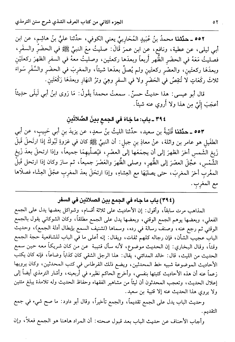[553] المذاهب مرت سابقاً، وأقول: إن الأحاديث على ثلاثة أقسام، وشواكل بعضها يدل على الجمع الفعلي، وبعضها يوهم الجمع الوقتي، وبعضها يدل على الجمع مطلقاً، وكان الشوكاني يقول بالجمع الوقتي ثم رجع عنه، وصنف رسالة في رده، وسماها (تشنيف السمع بإبطال أدلة الجمع) ، وحديث الباب عجيب الشأن، فإن رجاله كلهم ثقات، ويقال: إنه أعلى ما في الباب للشافعية حجة الجمع وقتاً، وقال البخاري: إن الحديث موضوع، لأنه سأل قتيبة عن من كان شريكاً معه حين سمع الحديث من الليث، قال: خالد المدائني، يقال: هذا الرجل الشقي كان كذاباً وضاعاً، فإنه كان يكتب الأحاديث الموضوعة شبيه خط المحدثين، ويضع ذلك القرطاس في كتب المحدثين، وكان يرويها زعماً عنه أن هذه الأحاديث كتبتها بنفسي، وأخرج الحاكم نظيره في أربعينه، وأشار الترمذي أيضاً إلى إعلال الحديث، وتعجب المحدثون أن ليثاً من مشاهير الفقهاء وحفاظ الحديث وله تلامذة يبلغ مئتين ولا يروي هذا الحديث عنه إلا قتيبة بن سعيد.