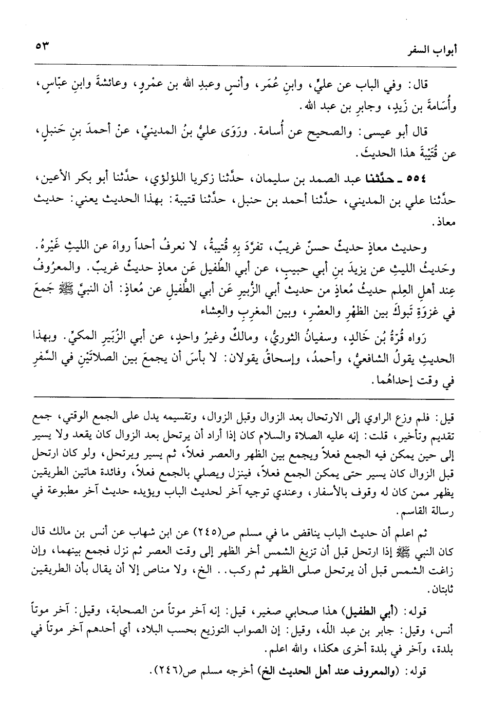 ثم اعلم أن حديث الباب يناقض ما في مسلم ص (245) عن ابن شهاب عن أنس بن مالك قال كان النبي - صَلَّى اللهُ عَلَيْهِ وَسَلَّمَ - إذا ارتحل قبل أن تزيغ الشمس أخر الظهر إلى وقت العصر ثم نزل فجمع بينهما، وإن زاغت الشمس قبل أن يرتحل صلى الظهر ثم ركب. . الخ، ولا مناص إلا أن يقال بأن الطريقين ثابتان.