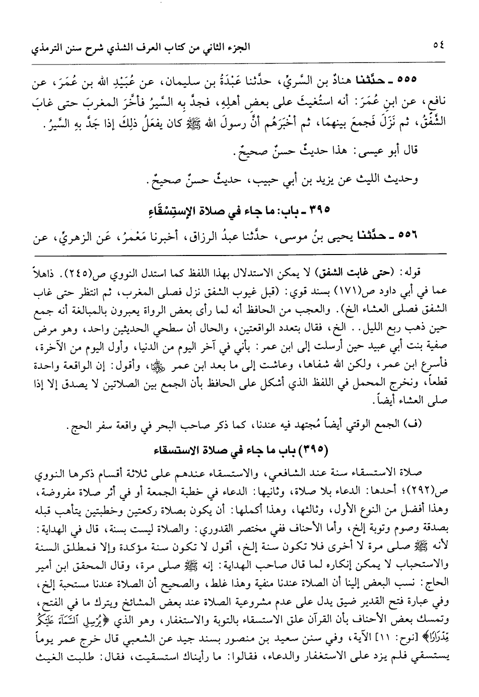 قوله: (حتى غابت الشفق) لا يمكن الاستدلال بهذا اللفظ كما استدل النووي ص (245) . ذاهلاً عما في أبي داود ص (171) بسند قوي: (قبل غيوب الشفق نزل فصلى المغرب، ثم انتظر حتى غاب الشفق فصلى العشاء الخ) . والعجب من الحافظ أنه لما رأى بعض الرواة يعبرون بالمبالغة أنه جمع حين ذهب ربع الليل. . الخ، فقال بتعدد الواقعتين، والحال أن سطحي الحديثين واحد، وهو مرض صفية بنت أبي عبيد حين أرسلت إلى ابن عمر: بأني في آخر اليوم من الدنيا، وأول اليوم من الآخرة، فأسرع ابن عمر، ولكن الله شفاها، وعاشت إلى ما بعد ابن عمر، وأقول: إن الواقعة واحدة قطعاً، ونخرج المحمل في اللفظ الذي أشكل على الحافظ بأن الجمع بين الصلاتين لا يصدق إلا إذا صلى العشاء أيضاً.