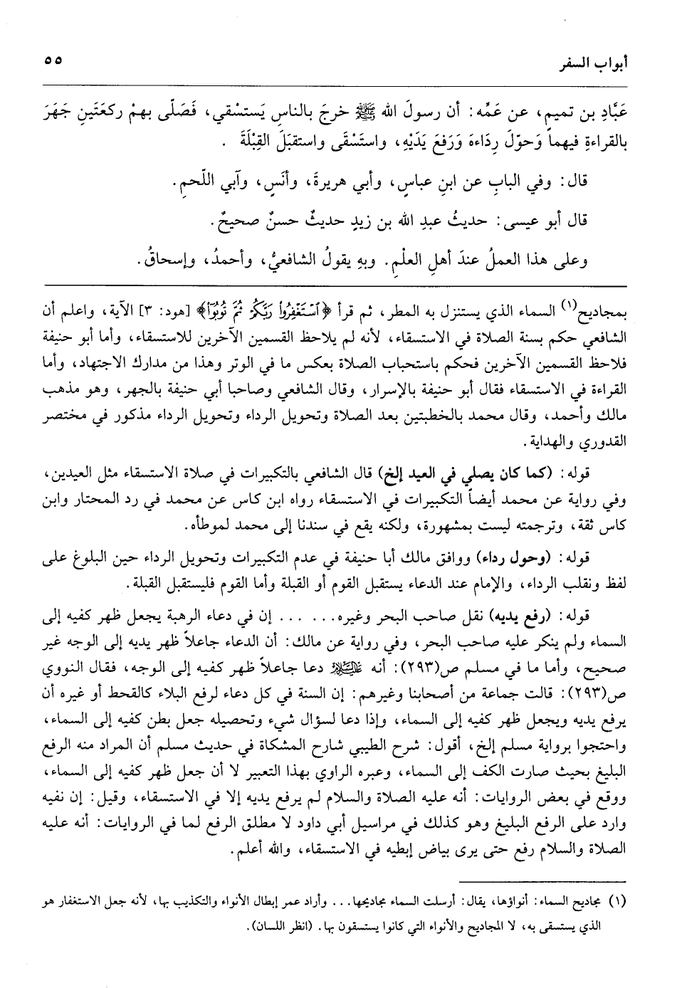 قوله: (وحول رداء) ووافق مالك أبا حنيفة في عدم التكبيرات وتحويل الرداء حين البلوغ على لفظ ونقلب الرداء، والإمام عند الدعاء يستقبل القوم أو القبلة وأما القوم فليستقبل القبلة.