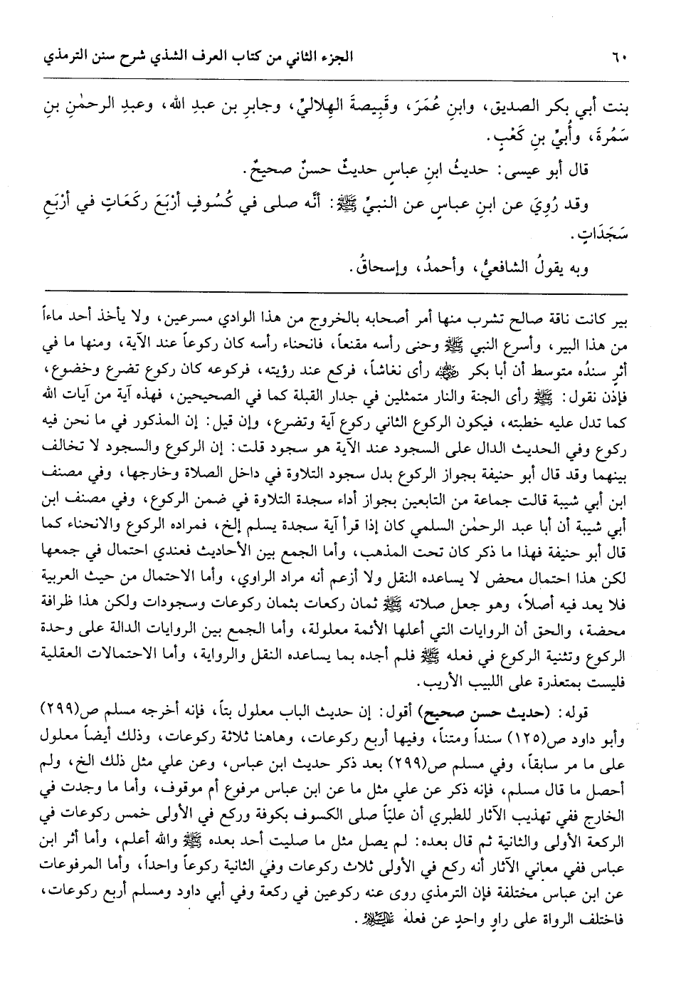 بير كانت ناقة صالح تشرب منها أمر أصحابه بالخروج من هذا الوادي مسرعين، ولا يأخذ أحد ماءاً من هذا البير، وأسرع النبي - صَلَّى اللهُ عَلَيْهِ وَسَلَّمَ - وحنى رأسه مقنعاً، فانحناء رأسه كان ركوعاً عند الآية، ومنها ما في أثرٍ سندُه متوسط أن أبا بكر رأى نغاشاً، فركع عند رؤيته، فركوعه كان ركوع تضرع وخضوع، فإذن نقول: - صَلَّى اللهُ عَلَيْهِ وَسَلَّمَ - رأى الجنة والنار متمثلين في جدار القبلة كما في الصحيحين، فهذه آية من آيات الله كما تدل عليه خطبته، فيكون الركوع الثاني ركوع آية وتضرع، وإن قيل: إن المذكور في ما نحن فيه ركوع وفي الحديث الدال على السجود عند الآية هو سجود قلت: إن الركوع والسجود لا تخالف بينهما وقد قال أبو حنيفة بجواز الركوع بدل سجود التلاوة في داخل الصلاة وخارجها، وفي مصنف ابن أبي شيبة قالت جماعة من التابعين بجواز أداء سجدة التلاوة في ضمن الركوع، وفي مصنف ابن أبي شيبة أن أبا عبد الرحمن السلمي كان إذا قرأ آية سجدة يسلم إلخ، فمراده الركوع والانحناء كما قال أبو حنيفة فهذا ما ذكر كان تحت المذهب، وأما الجمع بين الأحاديث فعندي احتمال في جمعها لكن هذا احتمال محض لا يساعده النقل ولا أزعم أنه مراد الراوي، وأما الاحتمال من حيث العربية فلا يعد فيه أصلاً، وهو جعل صلاته - صَلَّى اللهُ عَلَيْهِ وَسَلَّمَ - ثمان ركعات بثمان ركوعات وسجودات ولكن هذا ظرافة محضة، والحق أن الروايات التي أعلها الأئمة معلولة، وأما الجمع بين الروايات الدالة على وحدة الركوع وتثنية الركوع في فعله - صَلَّى اللهُ عَلَيْهِ وَسَلَّمَ - فلم أجده بما يساعده النقل والرواية، وأما الاحتمالات العقلية فليست بمتعذرة على اللبيب الأريب.