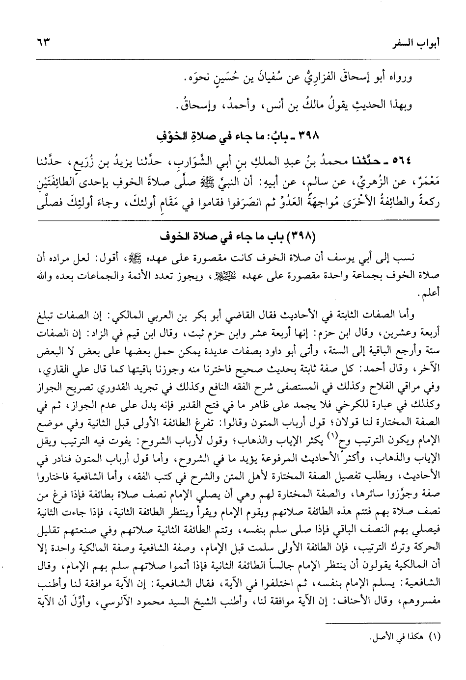 [564] نسب إلى أبي يوسف أن صلاة الخوف كانت مقصورة على عهده - صَلَّى اللهُ عَلَيْهِ وَسَلَّمَ -، أقول: لعل مراده أن صلاة الخوف بجماعة واحدة مقصورة على عهده، ويجوز تعدد الأئمة والجماعات بعده والله أعلم.