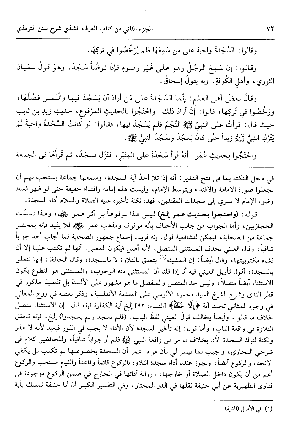 قوله: (واحتجوا بحديث عمر إلخ) ليس هذا مرفوعاً بل أثر عمر، وهذا تمسُّك الحجازيين، وأما الجواب من جانب الأحناف بأنه موقوف ومذهب عمر فلا يفيد فإنه بمحضر جماعة من الصحابة، فيمكن للشافعية قول: إنه قريب إجماع جمهور الصحابة فما أجاب أحد جواباً شافياً، وقال العيني بحذف المستثنى المتصل، لأنه أصل فيكون المعنى: أنها لم تكتب علينا إلا أن نشاء مكتوبيتها، وقال أيضاً: إن المشيئة يتعلق بالتلاوة لا بالسجدة، وقال الحافظ: إنها تتعلق بالسجدة، أقول تأويل العيني فيه أنا إذا قلنا أن المستثنى منه الوجوب، والمستثنى هو التطوع يكون الاستثناء أيضاً متصلاً، وليس حد المتصل والمنفصل ما هو مشهور على الألسنة بل تفصيله مذكور في قطر الندى وشرح الشيخ السيد محمود الآلوسي على المقدمة الأندلسية، وذكر بعضه في روح المعاني في وجوه المثاني تحت آية {إِلَّا خَطَأً} [النساء: 92] إلخ آية الكفارة فإنه قال: إن الاستثناء متصل خلاف ما قالوا، وأيضاً يخالف قولَ العيني لفظُ الباب: (فلم يسجد ولم يسجدوا) إلخ، فإنه تحقق التلاوة في واقعة الباب، وأما قول: إنه تأخير السجدة لأن الأداء لا يجب في الفور فبعيد لأنه لا عذر ونكتة لترك السجدة الآن بخلاف ما مر من واقعة النبي - صَلَّى اللهُ عَلَيْهِ وَسَلَّمَ - فلم أر جواباً شافياً، وللحافظين كلام في شرحي البخاري، وأجيب بما تيسر لي بأن مراد عمر أن السجدة بخصوصها لم تكتب بل يكفي الانحناء والركوع أيضاً، ويجوز عندنا أداء سجدة التلاوة بالركوع قائماً وقاعداً والقيام مستحب والركوع أعم من أن يكون داخل الصلاة أو خارجها، ورواية أدائها في الخارج في ضمن الركوع موجودة في فتاوى الظهيرية عن أبي حنيفة نقلها في الدر المختار، وفي التفسير الكبير أن أبا حنيفة تمسك بآية