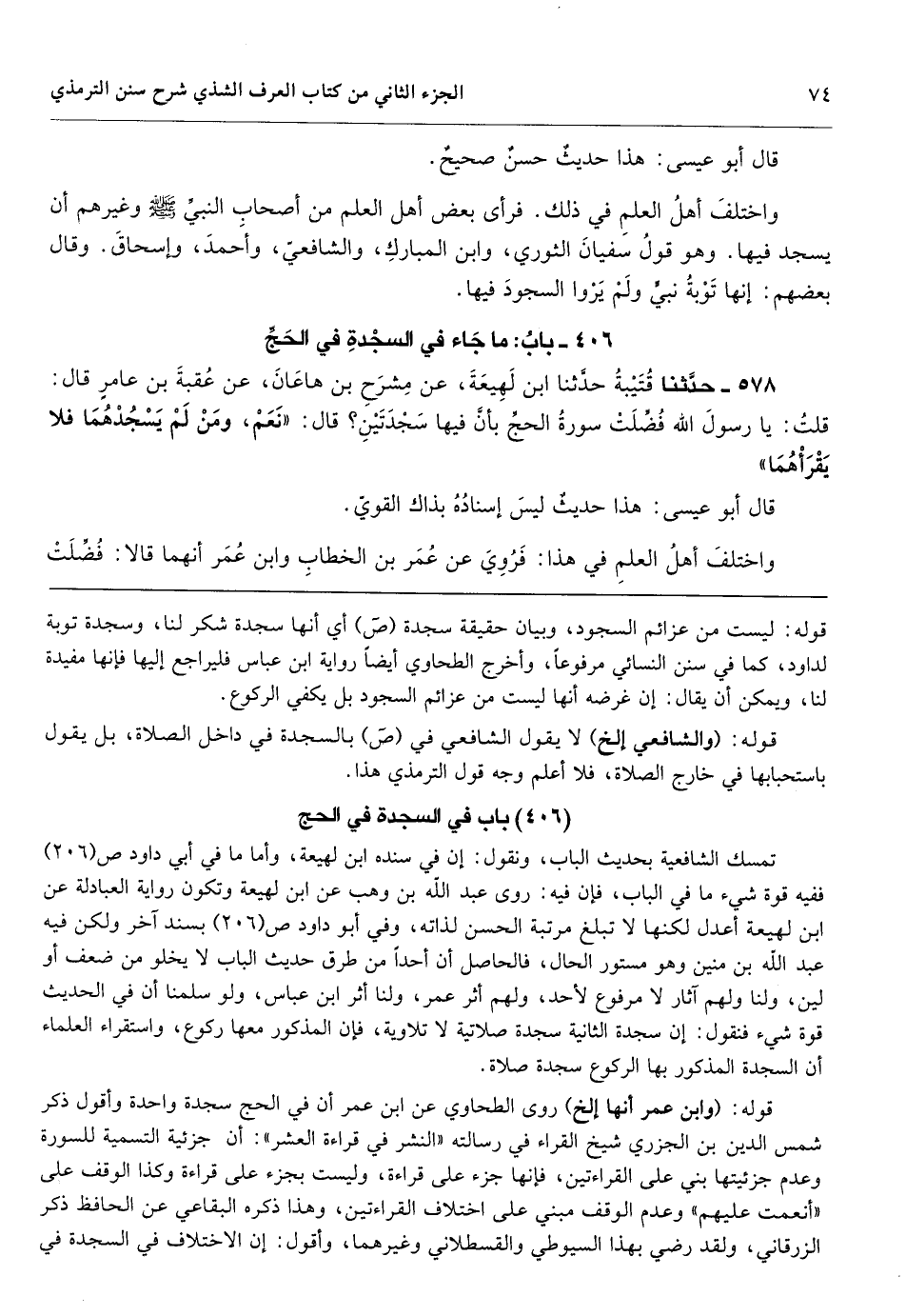 [578] تمسك الشافعية بحديث الباب، ونقول: إن في سنده ابن لهيعة، وأما ما في أبي داود ص (206) ففيه قوة شيء ما في الباب، فإن فيه: روى عبد الله بن وهب عن ابن لهيعة وتكون رواية العبادلة عن ابن لهيعة أعدل لكنها لا تبلغ مرتبة الحسن لذاته، وفي أبو داود ص (206) بسند آخر ولكن فيه عبد الله بن منين وهو مستور الحال، فالحاصل أن أحداً من طرق حديث الباب لا يخلو من ضعف أو لين، ولنا ولهم آثار لا مرفوع لأحد، ولهم أثر عمر، ولنا أثر ابن عباس، ولو سلمنا أن في الحديث قوة شيء فنقول: إن سجدة الثانية سجدة صلاتية لا تلاوية، فإن المذكور معها ركوع، واستقراء العلماء أن السجدة المذكور بها الركوع سجدة صلاة.
