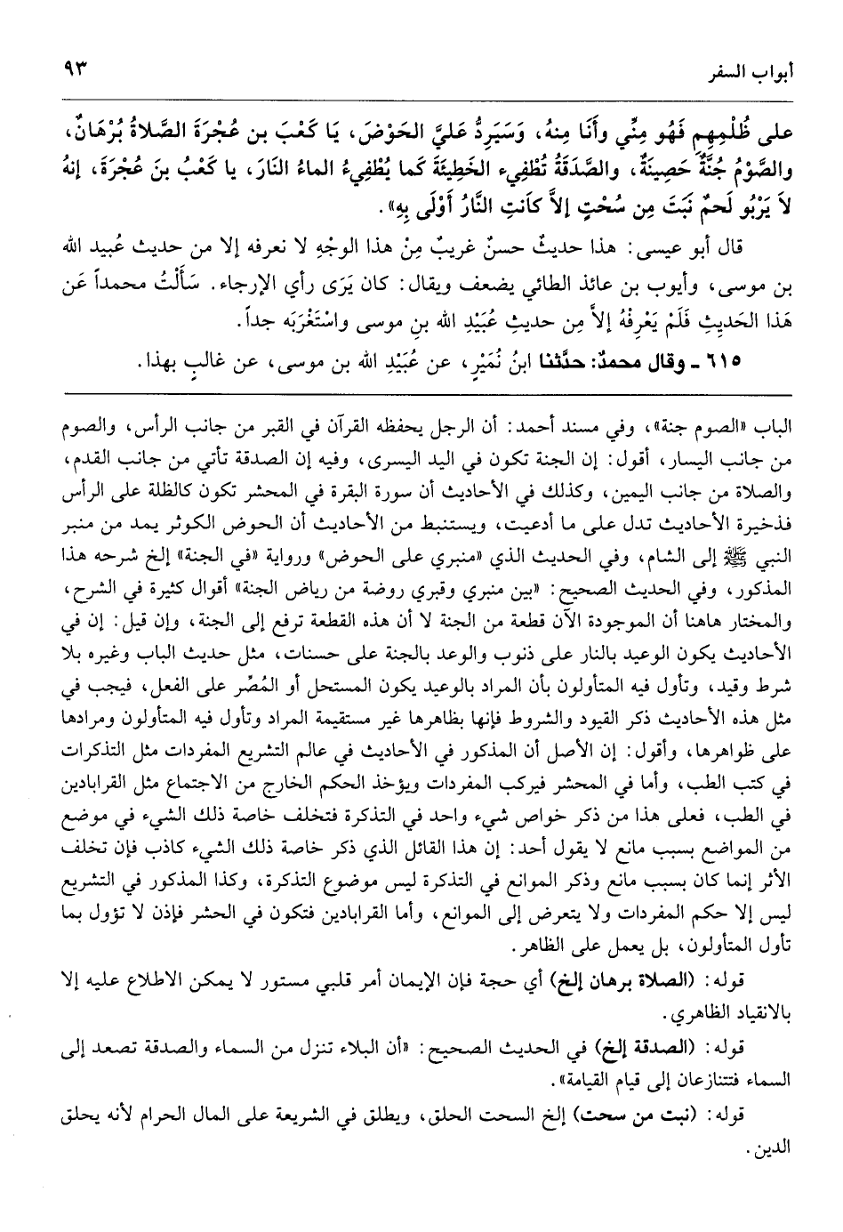 الباب «الصوم جنة» ، وفي مسند أحمد: أن الرجل يحفظه القرآن في القبر من جانب الرأس، والصوم من جانب اليسار، أقول: إن الجنة تكون في اليد اليسرى، وفيه إن الصدقة تأتي من جانب القدم، والصلاة من جانب اليمين، وكذلك في الأحاديث أن سورة البقرة في المحشر تكون كالظلة على الرأس فذخيرة الأحاديث تدل على ما أدعيت، ويستنبط من الأحاديث أن الحوض الكوثر يمد من منبر النبي - صَلَّى اللهُ عَلَيْهِ وَسَلَّمَ - إلى الشام، وفي الحديث الذي «منبري على الحوض» ورواية «في الجنة» إلخ شرحه هذا المذكور، وفي الحديث الصحيح: «بين منبري وقبري روضة من رياض الجنة» أقوال كثيرة في الشرح، والمختار هاهنا أن الموجودة الآن قطعة من الجنة لا أن هذه القطعة ترفع إلى الجنة، وإن قيل: إن في الأحاديث يكون الوعيد بالنار على ذنوب والوعد بالجنة على حسنات، مثل حديث الباب وغيره بلا شرط وقيد، وتأول فيه المتأولون بأن المراد بالوعيد يكون المستحل أو المُصِّر على الفعل، فيجب في مثل هذه الأحاديث ذكر القيود والشروط فإنها بظاهرها غير مستقيمة المراد وتأول فيه المتأولون ومرادها على ظواهرها، وأقول: إن الأصل أن المذكور في الأحاديث في عالم التشريع المفردات مثل التذكرات في كتب الطب، وأما في المحشر فيركب المفردات ويؤخذ الحكم الخارج من الاجتماع مثل القرابادين في الطب، فعلى هذا من ذكر خواص شيء واحد في التذكرة فتخلف خاصة ذلك الشيء في موضع من المواضع بسبب مانع لا يقول أحد: إن هذا القائل الذي ذكر خاصة ذلك الشيء كاذب فإن تخلف الأثر إنما كان بسبب مانع وذكر الموانع في التذكرة ليس موضوع التذكرة، وكذا المذكور في التشريع ليس إلا حكم المفردات ولا يتعرض إلى الموانع، وأما القرابادين فتكون في الحشر فإذن لا تؤول بما تأول المتأولون، بل يعمل على الظاهر.
