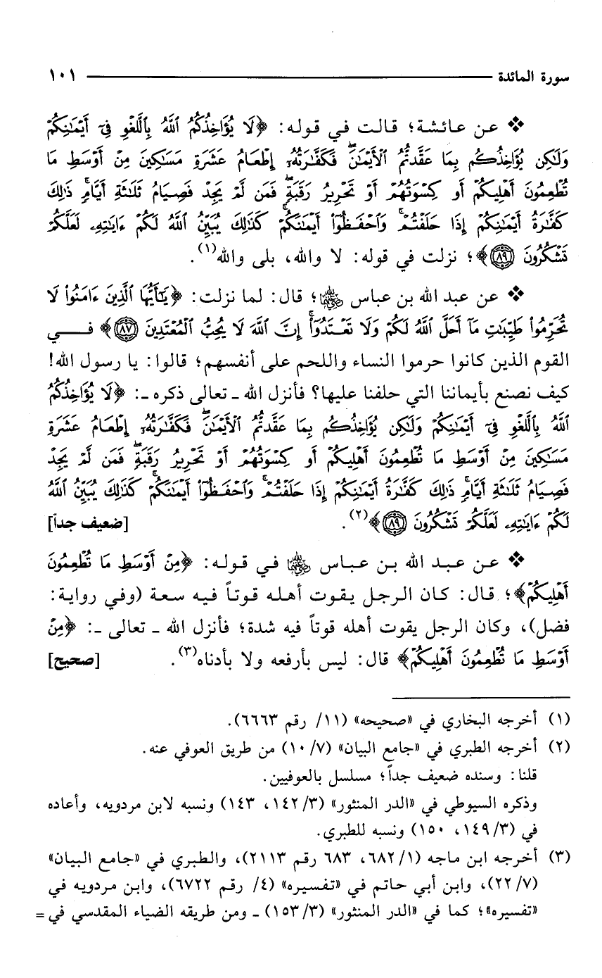 * عن عبد الله بن عباس -رضي الله عنهما-؛ قال: لما نزلت: {يَاأَيُّهَا الَّذِينَ آمَنُوا لَا تُحَرِّمُوا طَيِّبَاتِ مَا أَحَلَّ اللَّهُ لَكُمْ وَلَا تَعْتَدُوا إِنَّ اللَّهَ لَا يُحِبُّ الْمُعْتَدِينَ (87)} في القوم الذين كانوا حرموا النساء واللحم على أنفسهم؛ قالوا: يا رسول الله! كيف نصنع بأيماننا التي حلفنا عليها؟ فأنزل الله -تعالى ذكره-: {لَا يُؤَاخِذُكُمُ اللَّهُ بِاللَّغْوِ فِي أَيْمَانِكُمْ وَلَكِنْ يُؤَاخِذُكُمْ بِمَا عَقَّدْتُمُ الْأَيْمَانَ فَكَفَّارَتُهُ إِطْعَامُ عَشَرَةِ مَسَاكِينَ مِنْ أَوْسَطِ مَا تُطْعِمُونَ أَهْلِيكُمْ أَوْ كِسْوَتُهُمْ أَوْ تَحْرِيرُ رَقَبَةٍ فَمَنْ لَمْ يَجِدْ فَصِيَامُ ثَلَاثَةِ أَيَّامٍ ذَلِكَ كَفَّارَةُ أَيْمَانِكُمْ إِذَا حَلَفْتُمْ وَاحْفَظُوا أَيْمَانَكُمْ كَذَلِكَ يُبَيِّنُ اللَّهُ لَكُمْ آيَاتِهِ لَعَلَّكُمْ تَشْكُرُونَ (89)} (¬2). [ضعيف جداً]