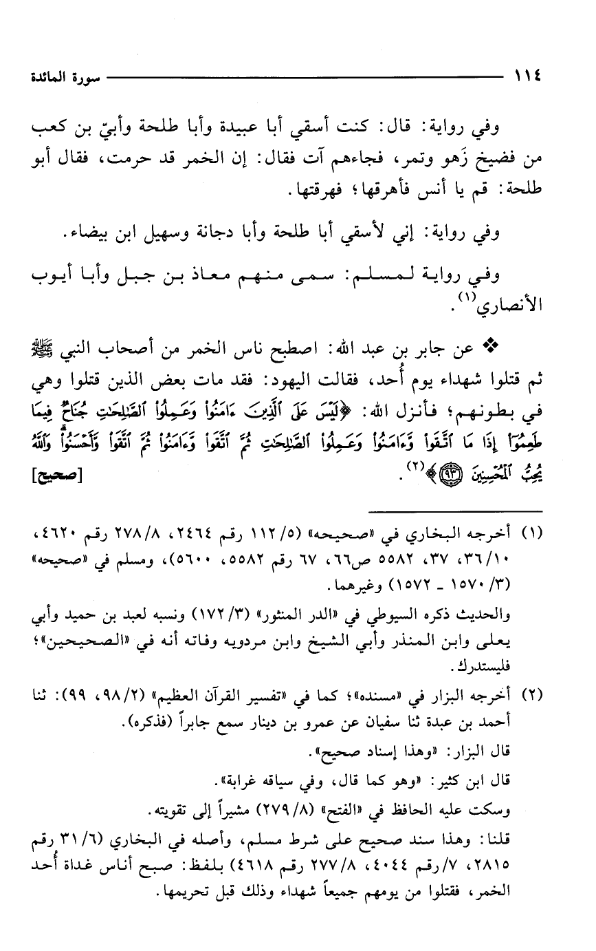 * عن جابر بن عبد الله: اصطبح ناس الخمر من أصحاب النبي - صلى الله عليه وسلم - ثم قتلوا شهداء يوم أُحد، فقالت اليهود: فقد مات بعض الذين قتلوا وهي في بطونهم؛ فأنزل الله: {لَيْسَ عَلَى الَّذِينَ آمَنُوا وَعَمِلُوا الصَّالِحَاتِ جُنَاحٌ فِيمَا طَعِمُوا إِذَا مَا اتَّقَوْا وَآمَنُوا وَعَمِلُوا الصَّالِحَاتِ ثُمَّ اتَّقَوْا وَآمَنُوا ثُمَّ اتَّقَوْا وَأَحْسَنُوا وَاللَّهُ يُحِبُّ الْمُحْسِنِينَ (93)} (¬2). [صحيح]
