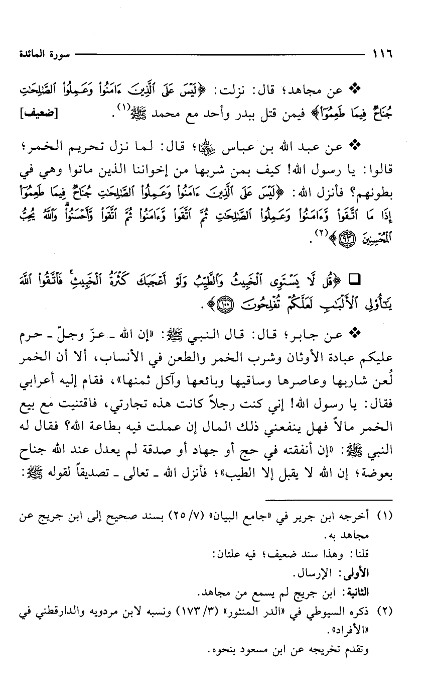 * عن عبد الله بن عباس -رضي الله عنهما-؛ قال: لما نزل تحريم الخمر؛ قالوا: يا رسول الله! كيف بمن شربها من إخواننا الذين ماتوا وهي في بطونهم؟ فأنزل الله: {لَيْسَ عَلَى الَّذِينَ آمَنُوا وَعَمِلُوا الصَّالِحَاتِ جُنَاحٌ فِيمَا طَعِمُوا إِذَا مَا اتَّقَوْا وَآمَنُوا وَعَمِلُوا الصَّالِحَاتِ ثُمَّ اتَّقَوْا وَآمَنُوا ثُمَّ اتَّقَوْا وَأَحْسَنُوا وَاللَّهُ يُحِبُّ الْمُحْسِنِينَ (93)} (¬2).