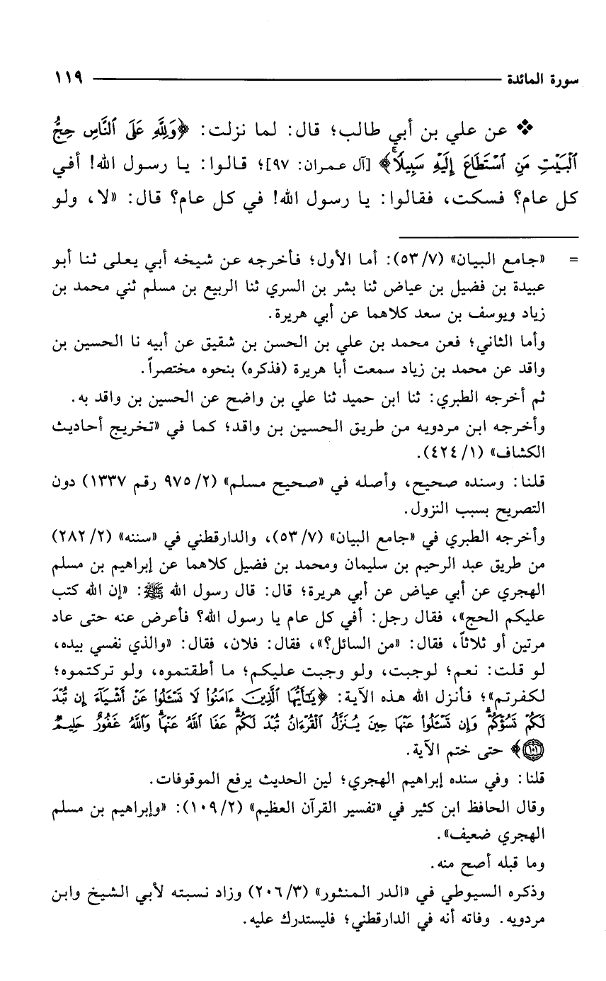 * عن علي بن أبي طالب؛ قال: لما نزلت: {وَلِلَّهِ عَلَى النَّاسِ حِجُّ الْبَيْتِ مَنِ اسْتَطَاعَ إِلَيْهِ سَبِيلًا} [آل عمران: 97]؛ قالوا: يا رسول الله! أفي كل عام؟ فسكت، فقالوا: يا رسول الله! في كل عام؟ قال: "لا, ولو