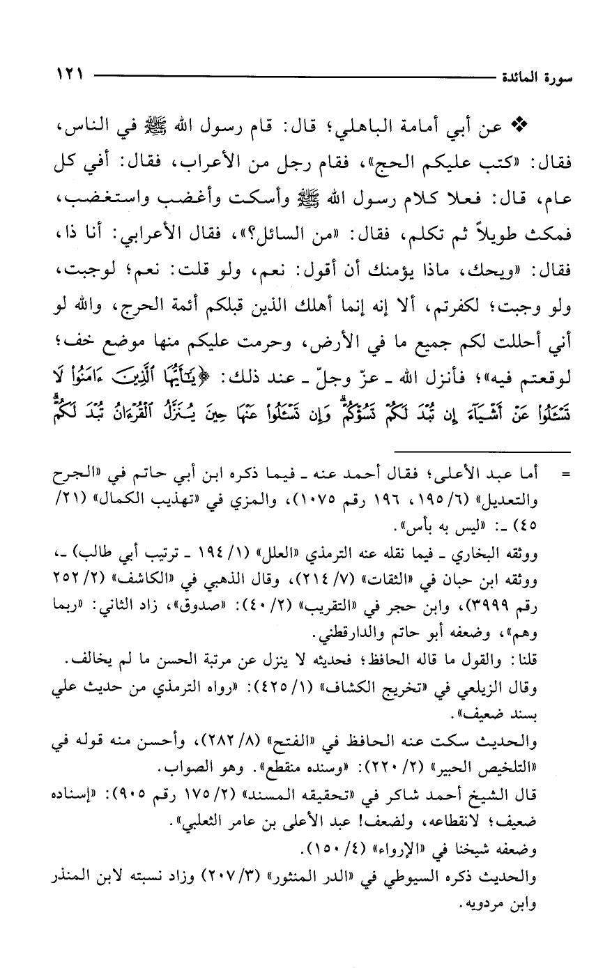 * عن أبي أمامة الباهلي؛ قال: قام رسول الله - صلى الله عليه وسلم - في الناس، فقال: "كتب عليكم الحج"، فقام رجل من الأعراب، فقال: أفي كل عام، قال: فعلا كلام رسول الله - صلى الله عليه وسلم - وأسكت وأغضب واستغضب، فمكث طويلاً ثم تكلم، فقال: "من السائل؟ "، فقال الأعرابي: أنا ذا، فقال: "ويحك، ماذا يؤمنك أن أقول: نعم، ولو قلت: نعم؛ لوجبت، ولو وجبت؛ لكفرتم، ألا إنه إنما أهلك الذين قبلكم أئمة الحرج، والله لو أني أحللت لكم جميع ما في الأرض، وحرمت عليكم منها موضع خف؛ لوقعتم فيه"؛ فأنزل الله -عزّ وجلّ- عند ذلك: {يَاأَيُّهَا الَّذِينَ آمَنُوا لَا تَسْأَلُوا عَنْ أَشْيَاءَ إِنْ تُبْدَ لَكُمْ تَسُؤْكُمْ وَإِنْ تَسْأَلُوا عَنْهَا حِينَ يُنَزَّلُ الْقُرْآنُ تُبْدَ لَكُمْ