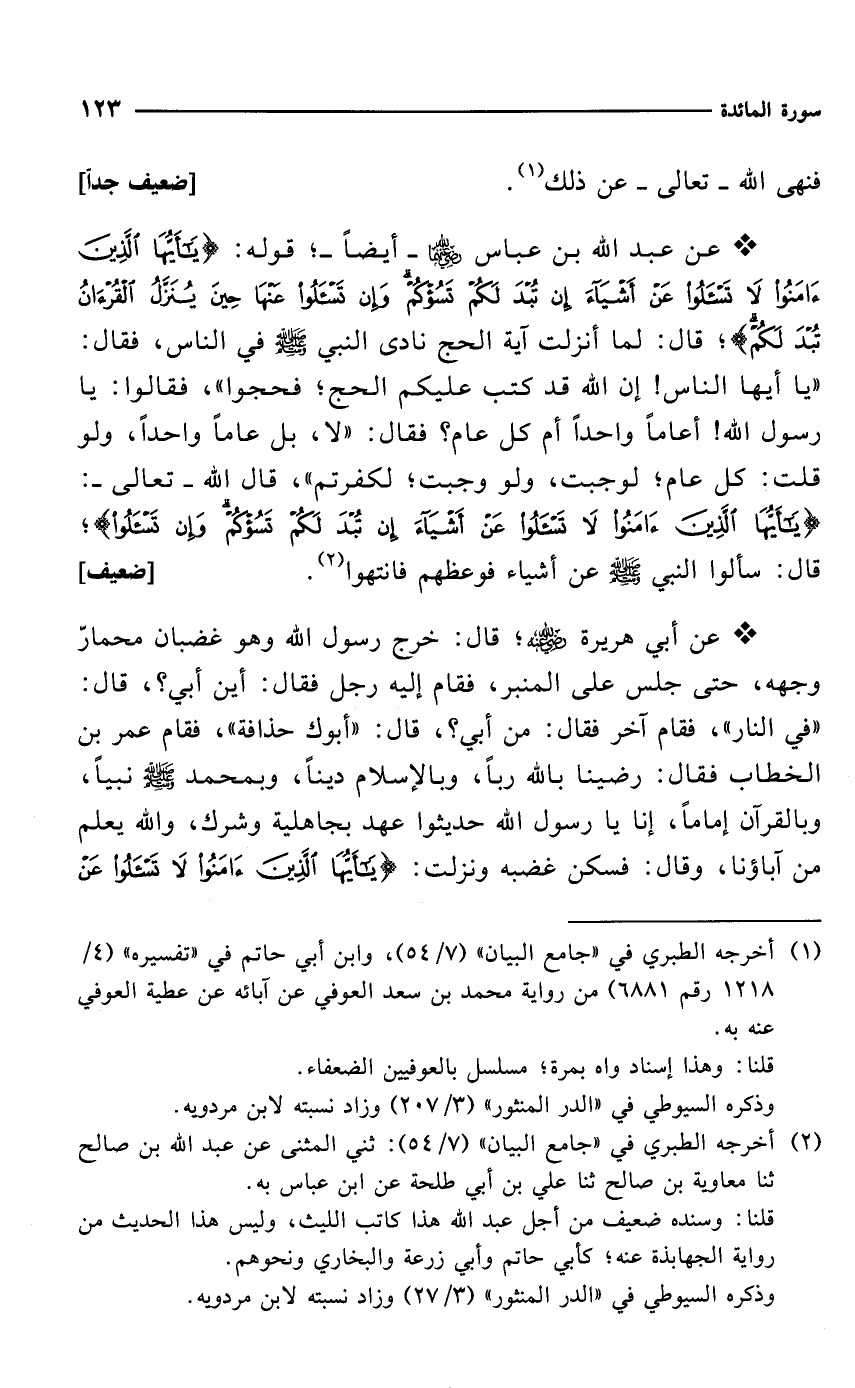 * عن عبد الله بن عباس -رضي الله عنهما-أيضاً-؛ قوله: {يَاأَيُّهَا الَّذِينَ آمَنُوا لَا تَسْأَلُوا عَنْ أَشْيَاءَ إِنْ تُبْدَ لَكُمْ تَسُؤْكُمْ وَإِنْ تَسْأَلُوا عَنْهَا حِينَ يُنَزَّلُ الْقُرْآنُ تُبْدَ لَكُمْ}؛ قال: لما أنزلت آية الحج نادى النبي - صلى الله عليه وسلم - في الناس، فقال: "يا أيها الناس! إن الله قد كتب عليكم الحج؛ فحجوا"، فقالوا: يا رسول الله! أعاماً واحداً أم كل عام؟ فقال: "لا، بل عاماً واحداً، ولو قلت: كل عام؛ لوجبت، ولو وجبت؛ لكفرتم"، قال الله -تعالى-: {يَاأَيُّهَا الَّذِينَ آمَنُوا لَا تَسْأَلُوا عَنْ أَشْيَاءَ إِنْ تُبْدَ لَكُمْ تَسُؤْكُمْ وَإِنْ تَسْأَلُوا}؛ قال: سألوا النبي - صلى الله عليه وسلم - عن أشياء فوعظهم فانتهوا (¬2). [ضعيف]