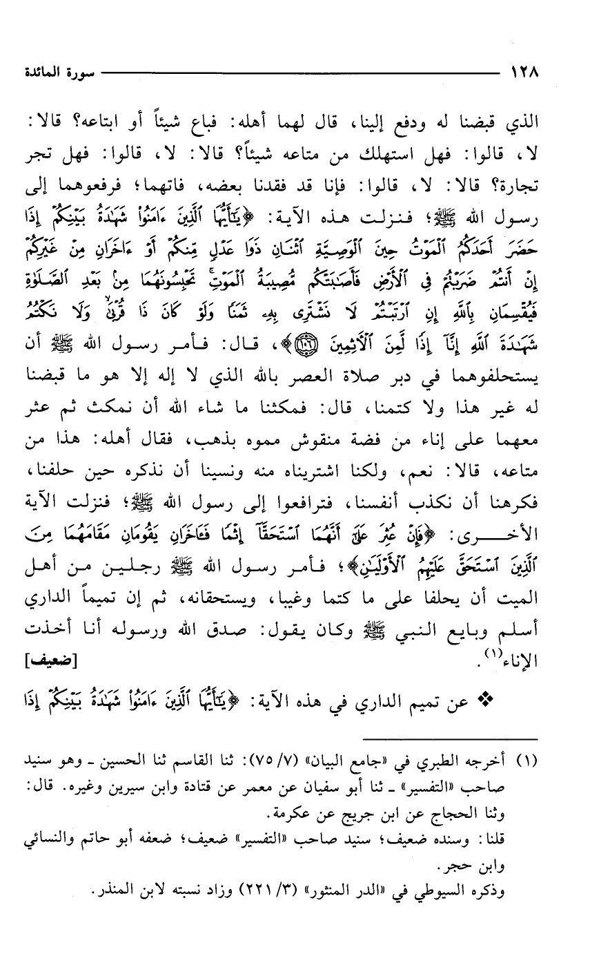 * عن تميم الداري في هذه الآية: {يَاأَيُّهَا الَّذِينَ آمَنُوا شَهَادَةُ بَيْنِكُمْ إِذَا