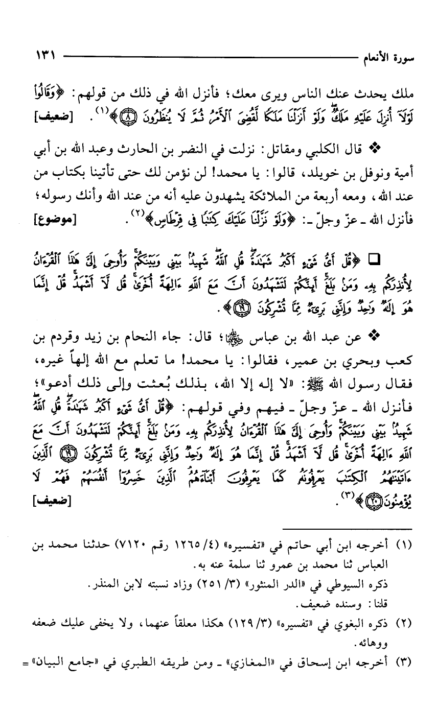 * عن عبد الله بن عباس -رضي الله عنهما-؛ قال: جاء النحام بن زيد وقردم بن كعب وبحري بن عمير، فقالوا: يا محمد! ما تعلم مع الله إلهاً غيره، فقال رسول الله - صلى الله عليه وسلم -: "لا إله إلا الله، بذلك بُعثت وإلى ذلك أدعو"؛ فأنزل الله -عزّ وجلّ- فيهم وفي قولهم: {قُلْ أَيُّ شَيْءٍ أَكْبَرُ شَهَادَةً قُلِ الله شَهِيدٌ بَيْنِي وَبَيْنَكُمْ وَأُوحِيَ إِلَيَّ هَذَا الْقُرْآنُ لِأُنْذِرَكُمْ بِهِ وَمَنْ بَلَغَ أَئِنَّكُمْ لَتَشْهَدُونَ أَنَّ مَعَ اللهِ آلِهَةً أُخْرَى قُلْ لَا أَشْهَدُ قُلْ إِنَّمَا هُوَ إِلَهٌ وَاحِدٌ وَإِنَّنِي بَرِيءٌ مِمَّا تُشْرِكُونَ (19) الَّذِينَ آتَيْنَاهُمُ الْكِتَابَ يَعْرِفُونَهُ كَمَا يَعْرِفُونَ أَبْنَاءَهُمُ الَّذِينَ خَسِرُوا أَنْفُسَهُمْ فَهُمْ لَا يُؤْمِنُونَ (20)} (¬3). [ضعيف]