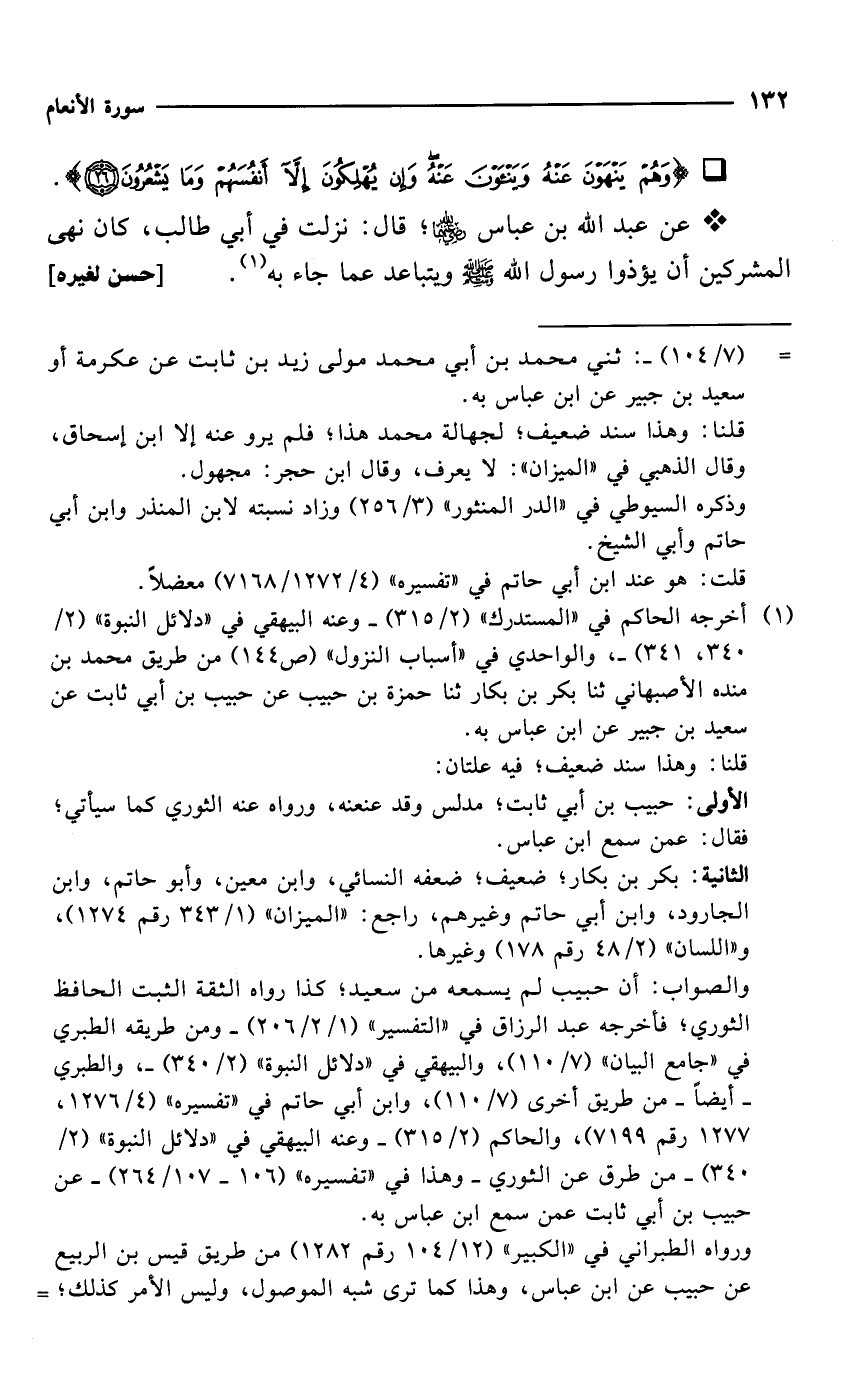 * عن عبد الله بن عباس -رضي الله عنهما-؛ قال: نزلت في أبي طالب، كان نهى المشركين أن يؤذوا رسول الله - صلى الله عليه وسلم - ويتباعد عما جاء به (¬1). [حسن لغيره]