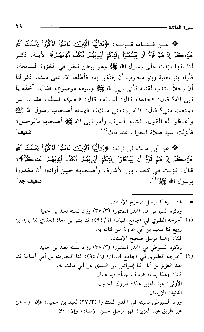 * عن أبي مالك في قوله: {يَاأَيُّهَا الَّذِينَ آمَنُوا اذْكُرُوا نِعْمَتَ اللَّهِ عَلَيْكُمْ إِذْ هَمَّ قَوْمٌ أَنْ يَبْسُطُوا إِلَيْكُمْ أَيْدِيَهُمْ فَكَفَّ أَيْدِيَهُمْ عَنْكُمْ}؛ قال: نزلت في كعب بن الأشرف وأصحابه حين أرادوا أن يغدروا برسول الله - صلى الله عليه وسلم - (¬2). [ضعيف جداً]